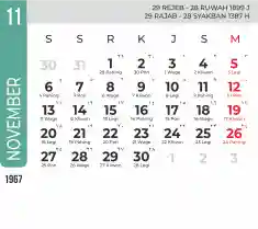File template kalender 1967 yang editable (bisa anda edit) untuk CorelDRAW, format warna cmyk dan rgb untuk kebutuhan percetakan. Bisa custom hari libur (gunakan fitur tabel dibawah untuk edit).