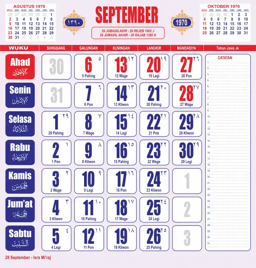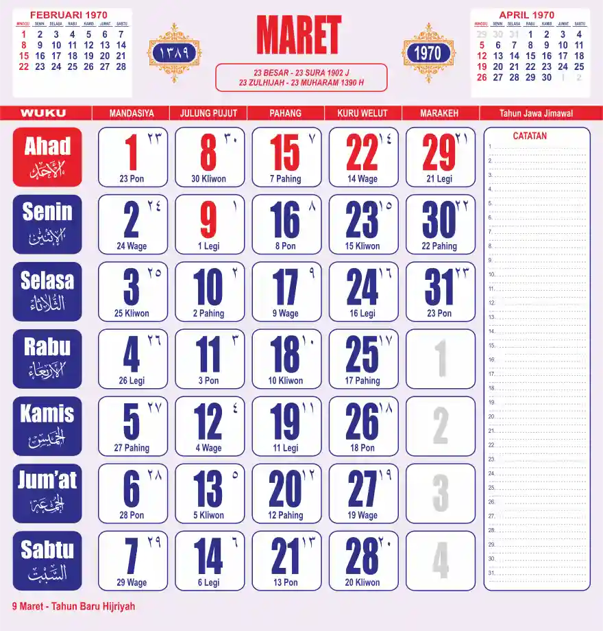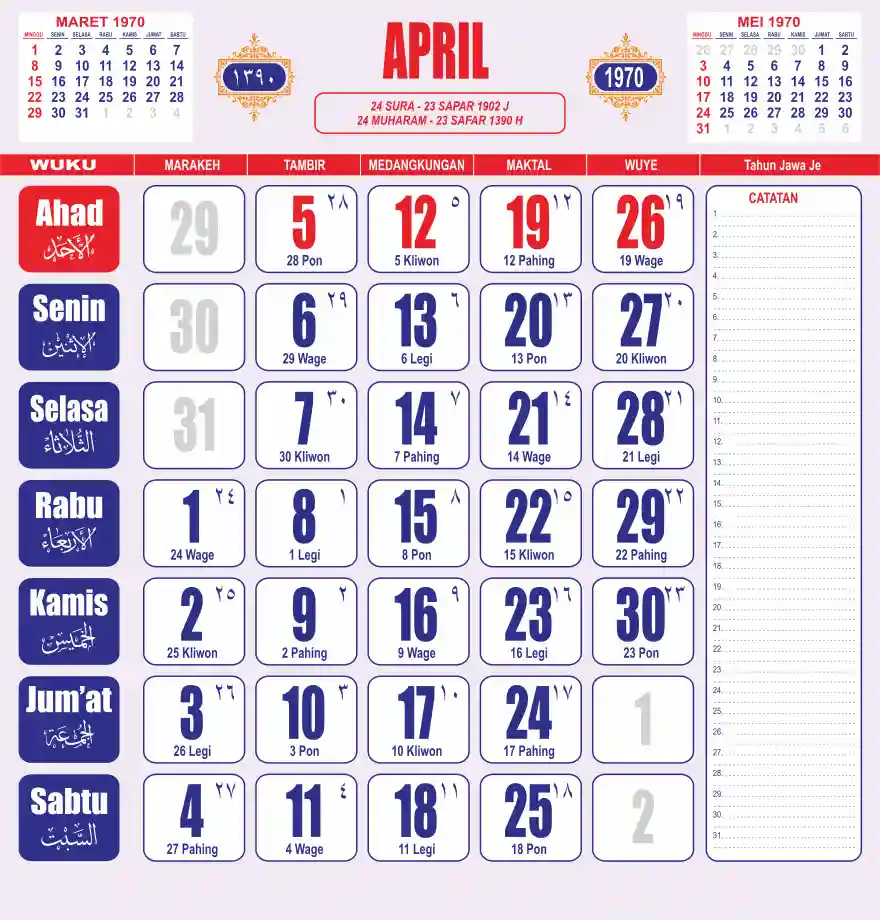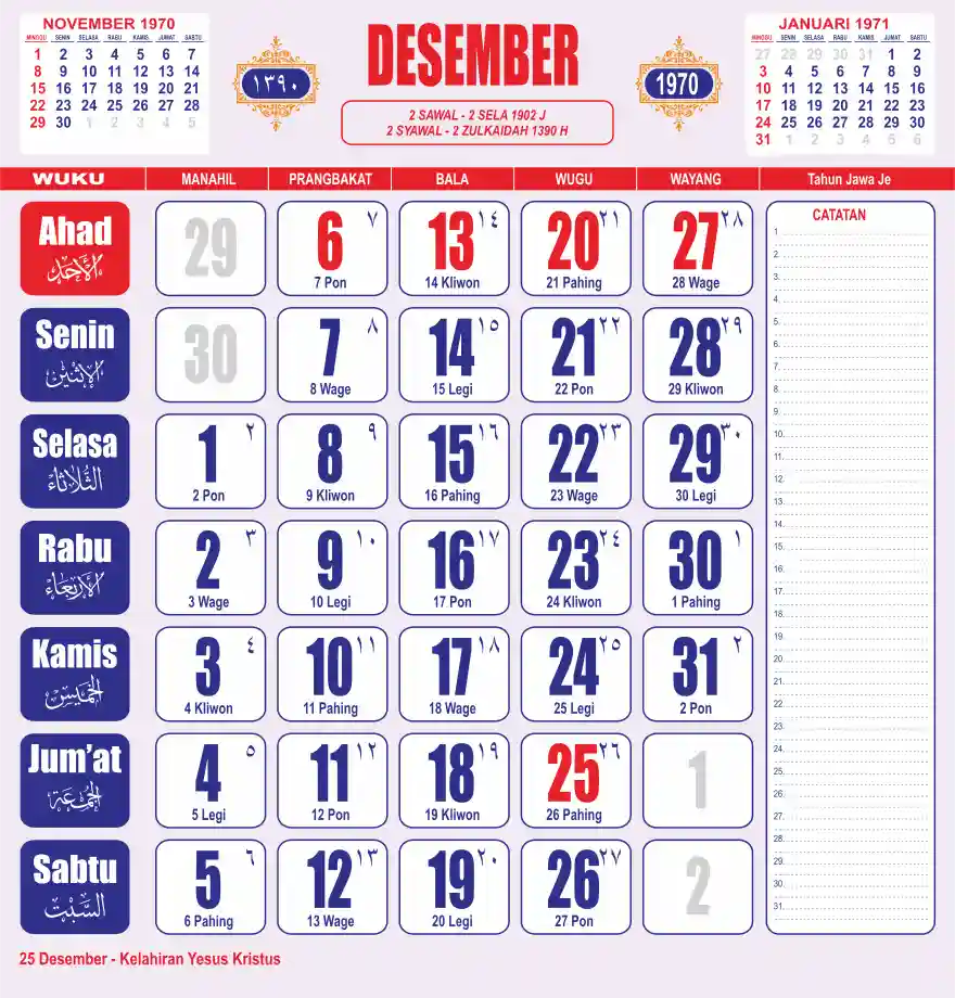 Template kalender 1970 lembaran besar jumbo yang sering dipakai oleh masyarakat jawa lengkap dengan wuku. Kalender ini biasanya di cetak 1 lembar per bulan.