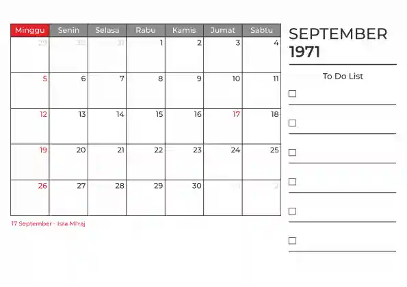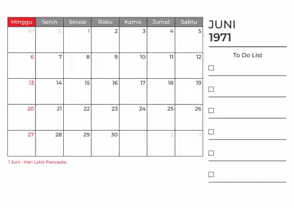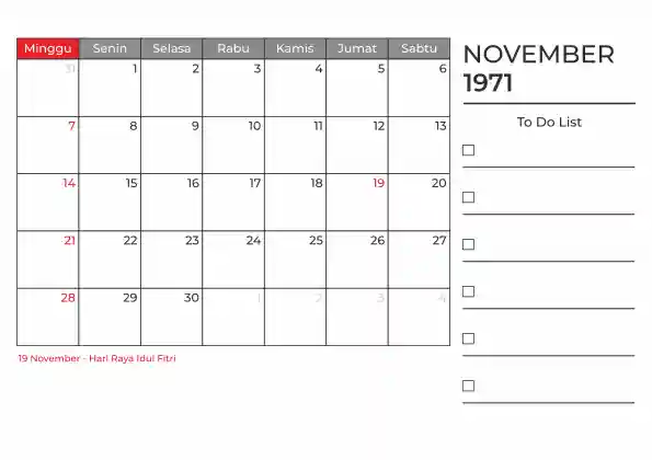 Template kalender 1971 duduk planner. Ada space kosong yang bisa di isi untuk menulis catatan dan ada space untuk menulis to do list.