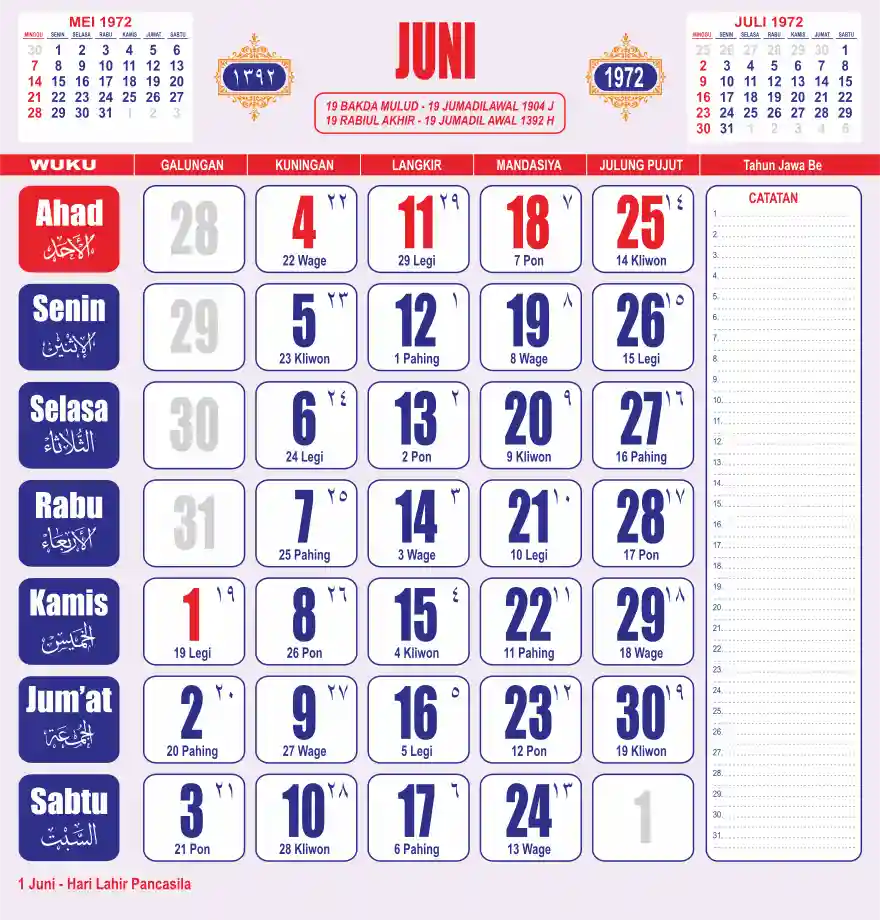 Template kalender 1972 lembaran besar jumbo yang sering dipakai oleh masyarakat jawa lengkap dengan wuku. Kalender ini biasanya di cetak 1 lembar per bulan.