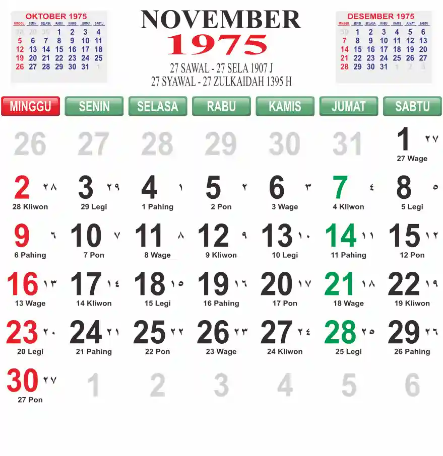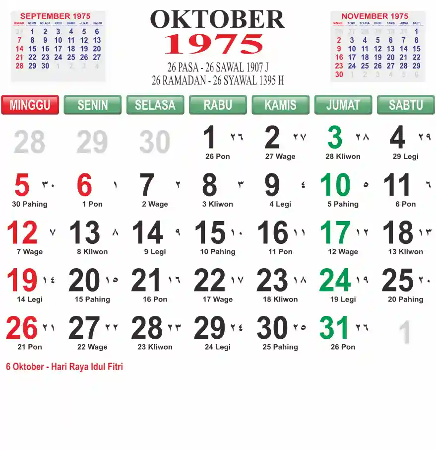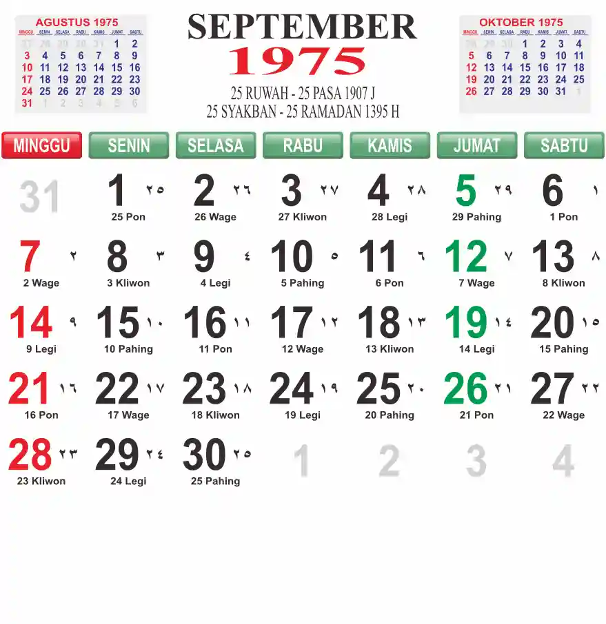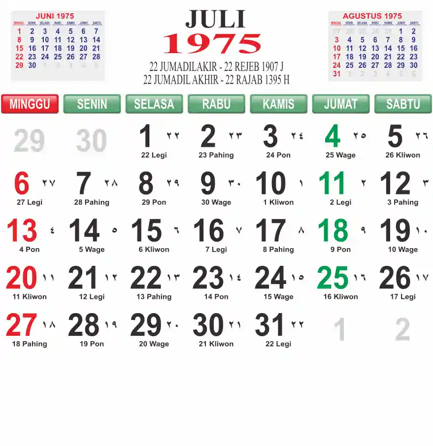 Template kalender 1975 lembaran besar jumbo yang mudah di baca dari jarak jauh. Kalender ini biasanya di cetak 1 lembar per bulan.