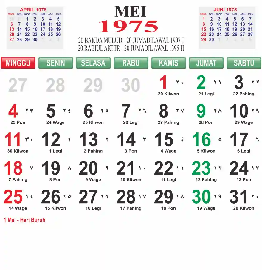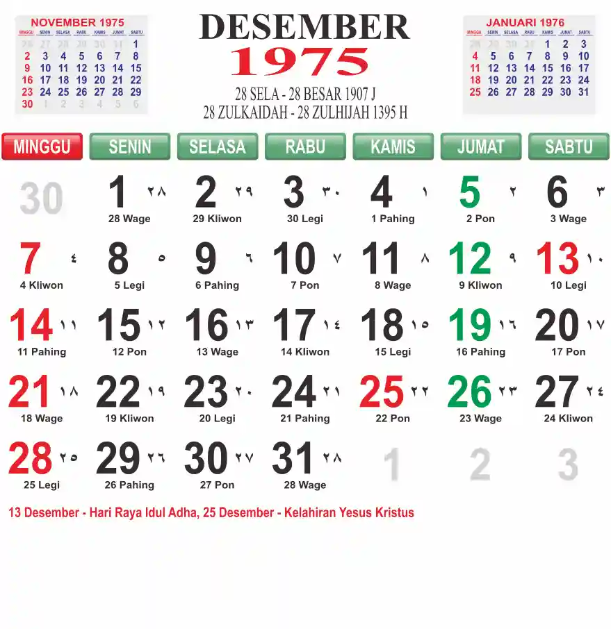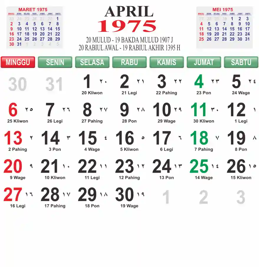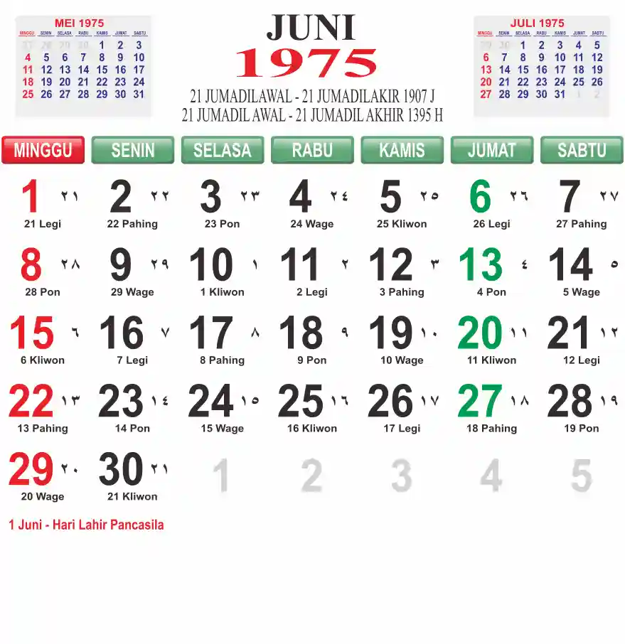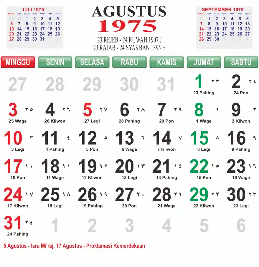 Template kalender 1975 lembaran besar jumbo yang mudah di baca dari jarak jauh. Kalender ini biasanya di cetak 1 lembar per bulan.