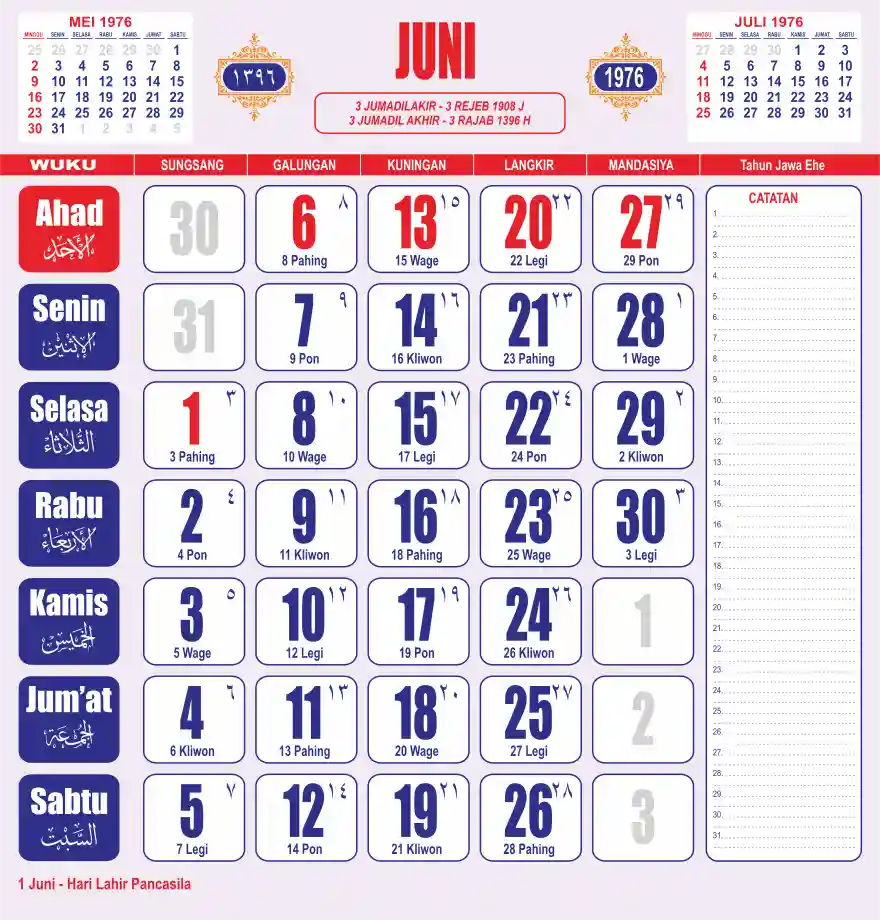 Template kalender 1976 lembaran besar jumbo yang sering dipakai oleh masyarakat jawa lengkap dengan wuku. Kalender ini biasanya di cetak 1 lembar per bulan.