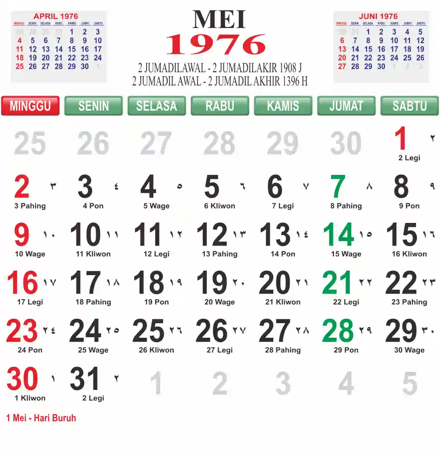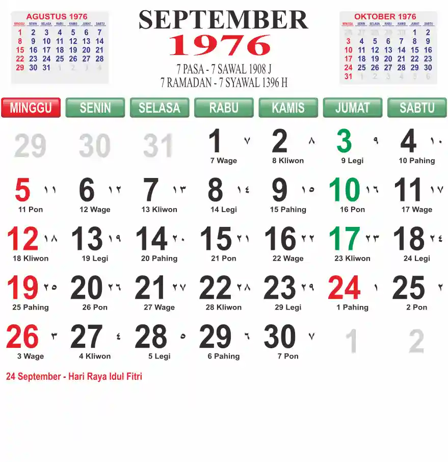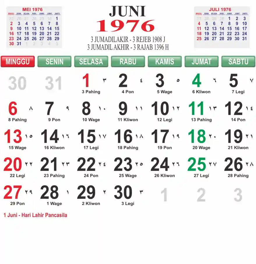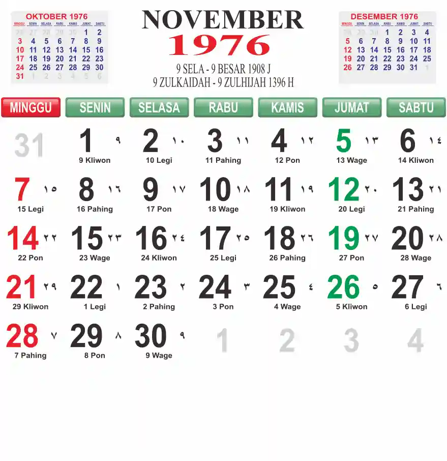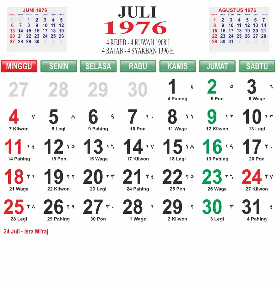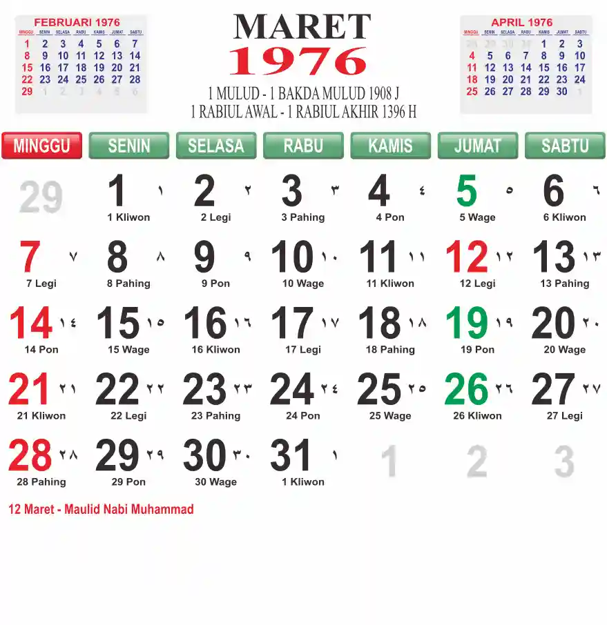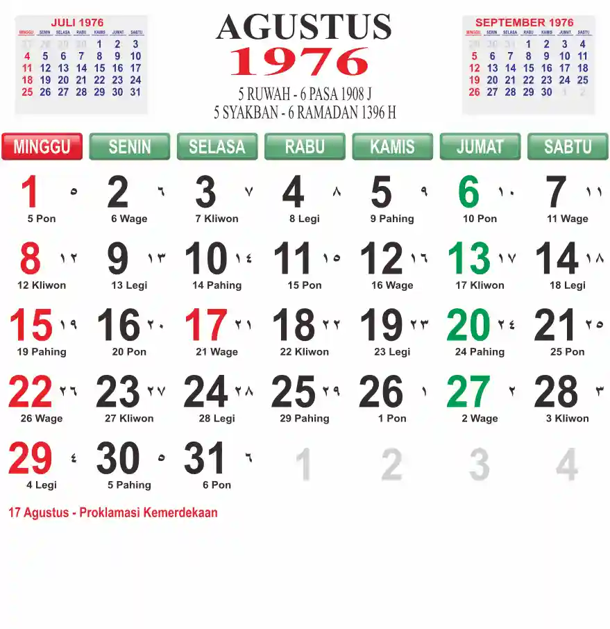 Template kalender 1976 lembaran besar jumbo yang mudah di baca dari jarak jauh. Kalender ini biasanya di cetak 1 lembar per bulan.