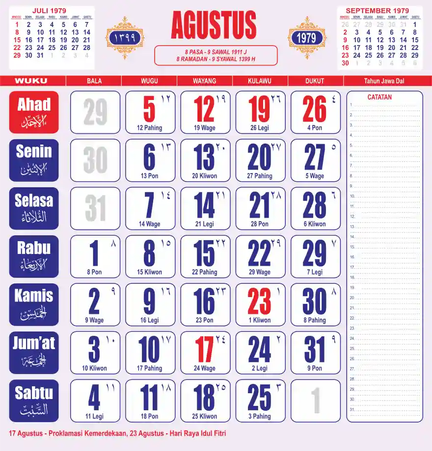 Template kalender 1979 lembaran besar jumbo yang sering dipakai oleh masyarakat jawa lengkap dengan wuku. Kalender ini biasanya di cetak 1 lembar per bulan.