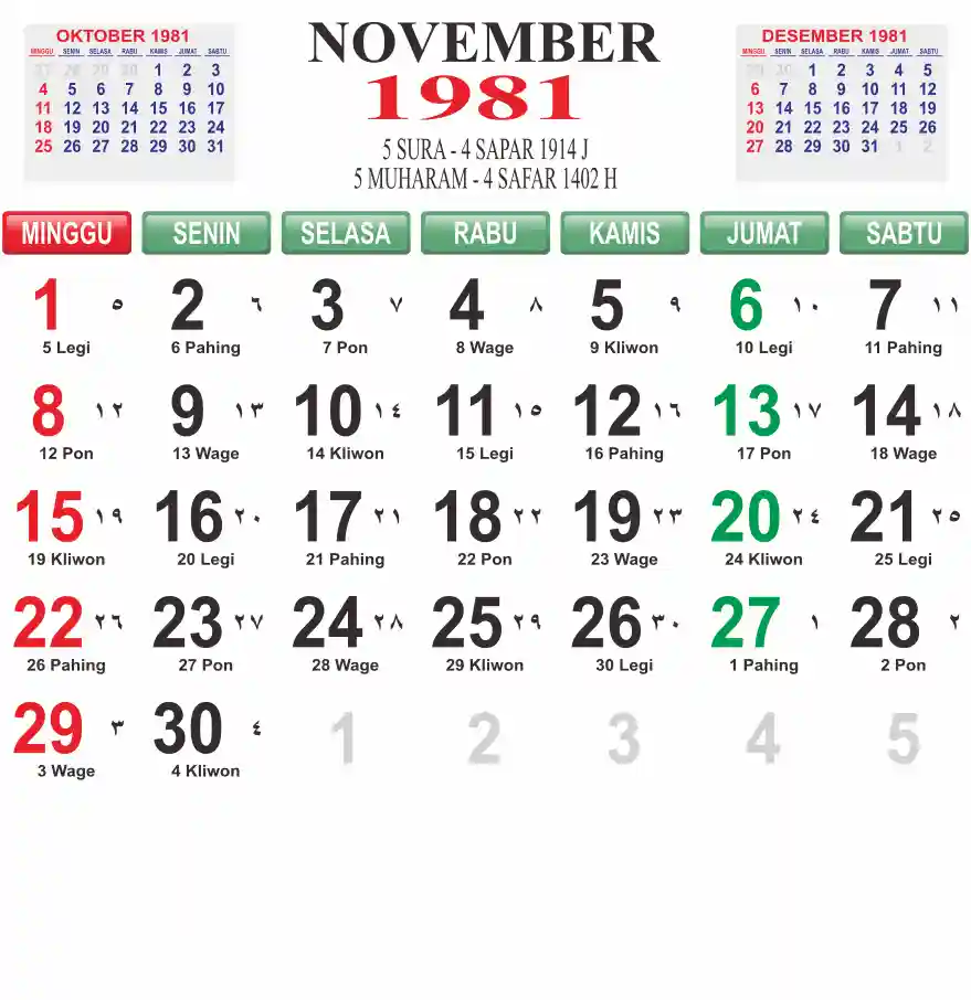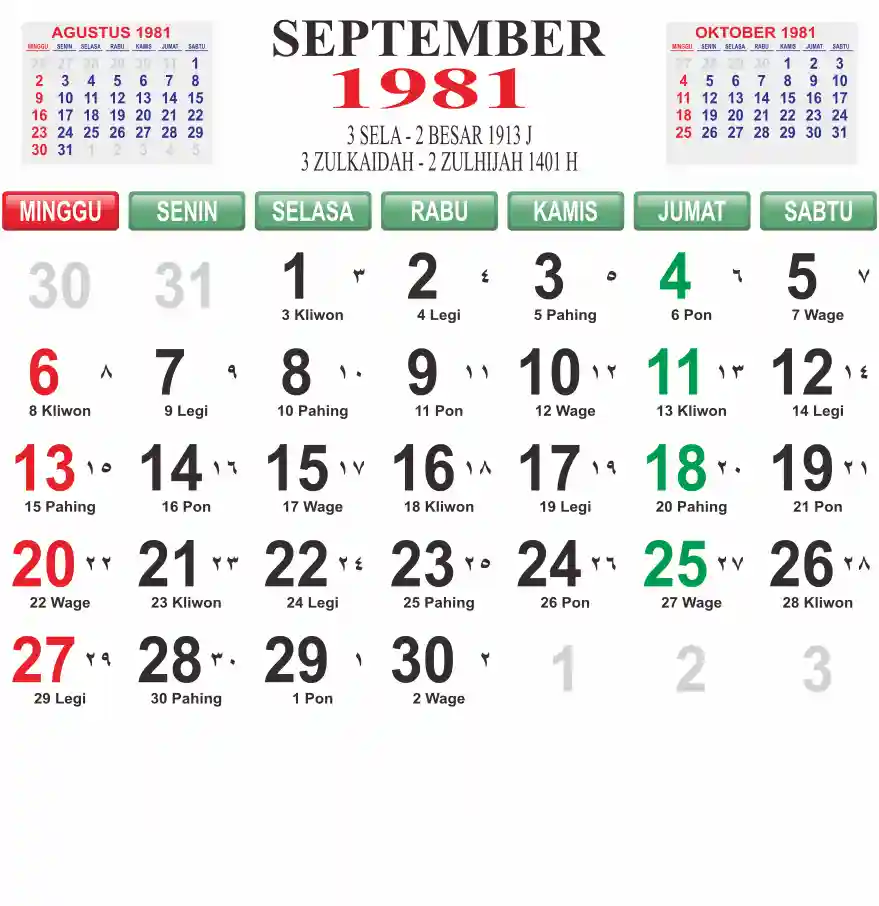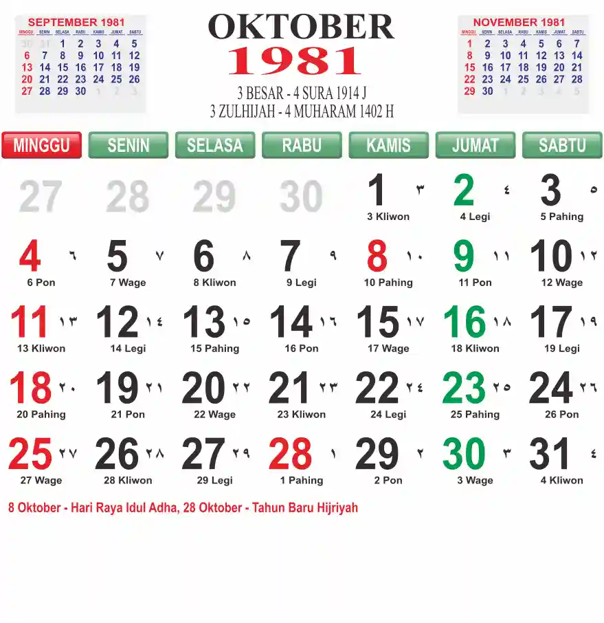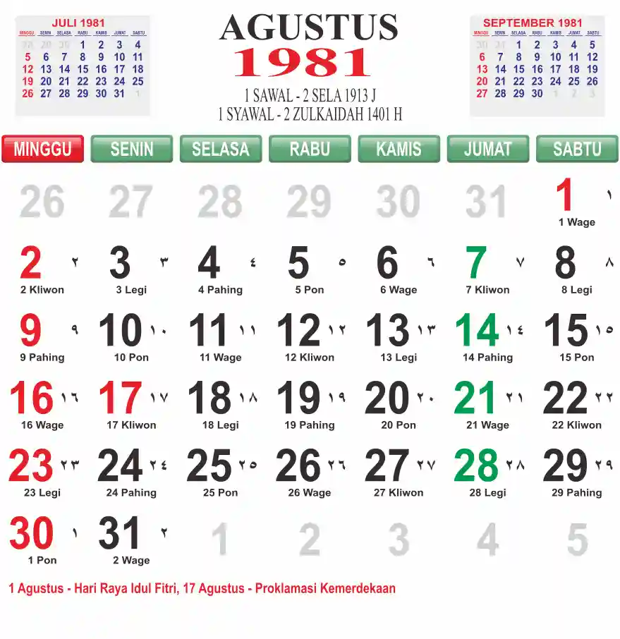 Template kalender 1981 lembaran besar jumbo yang mudah di baca dari jarak jauh. Kalender ini biasanya di cetak 1 lembar per bulan.