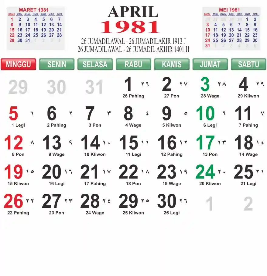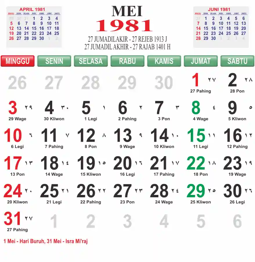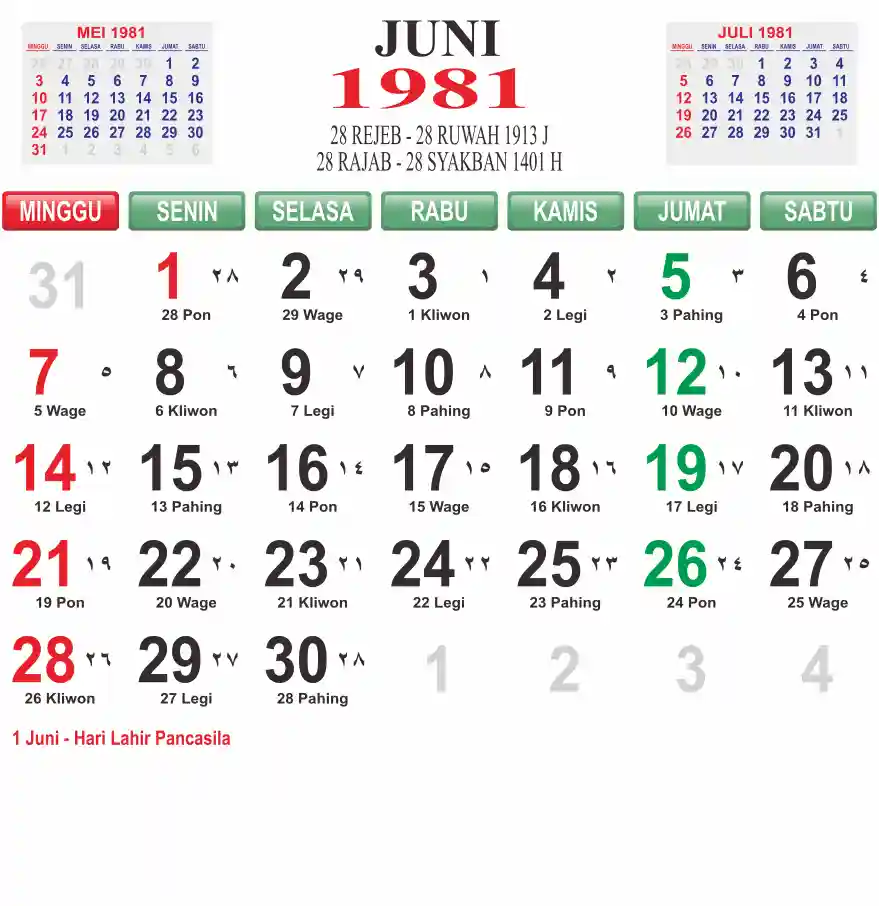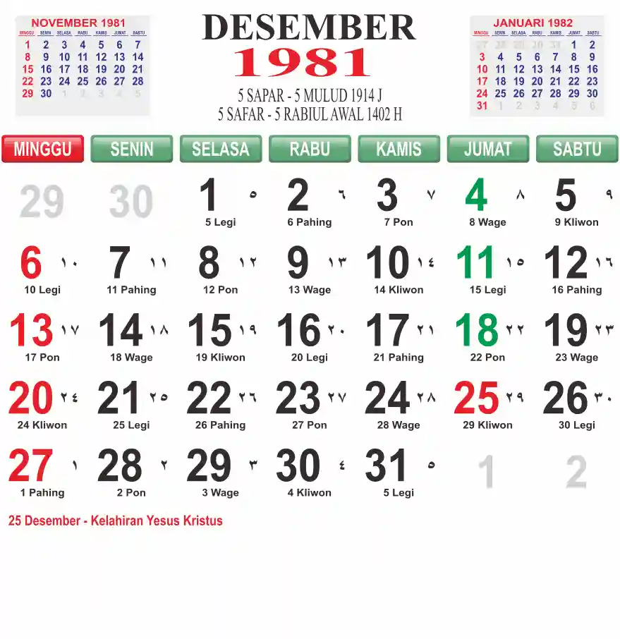Template kalender 1981 lembaran besar jumbo yang mudah di baca dari jarak jauh. Kalender ini biasanya di cetak 1 lembar per bulan.
