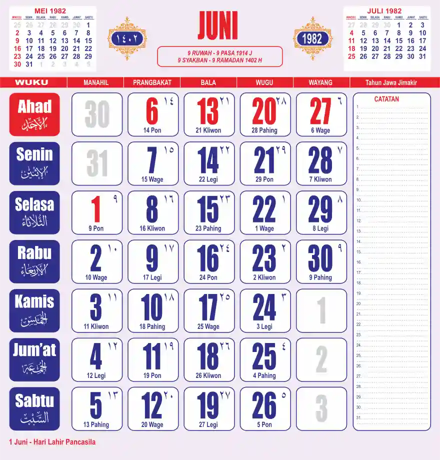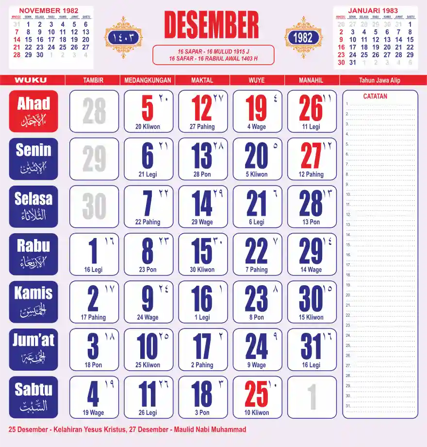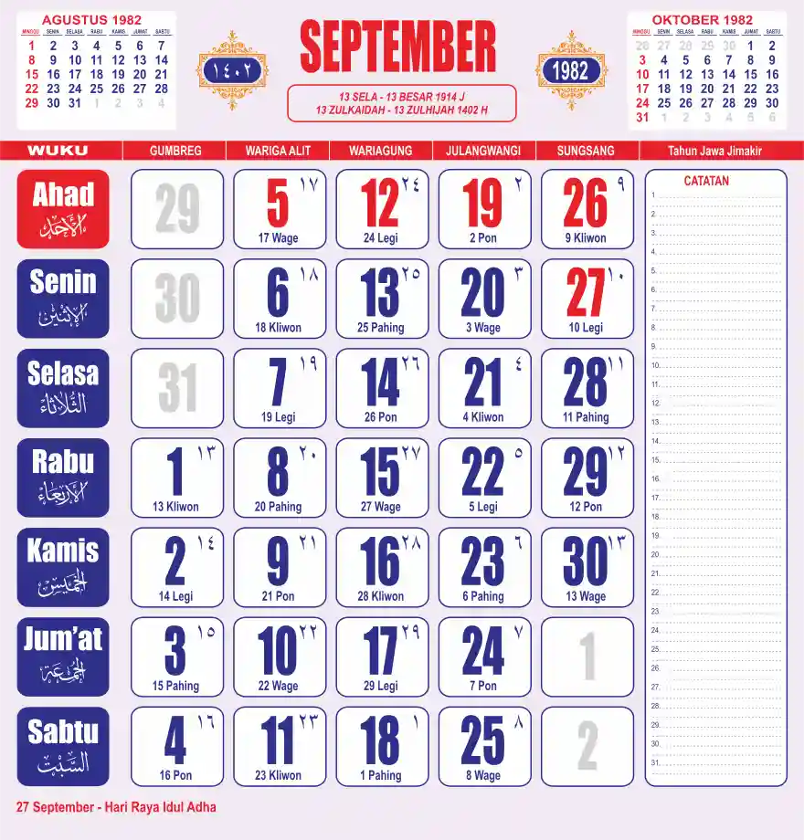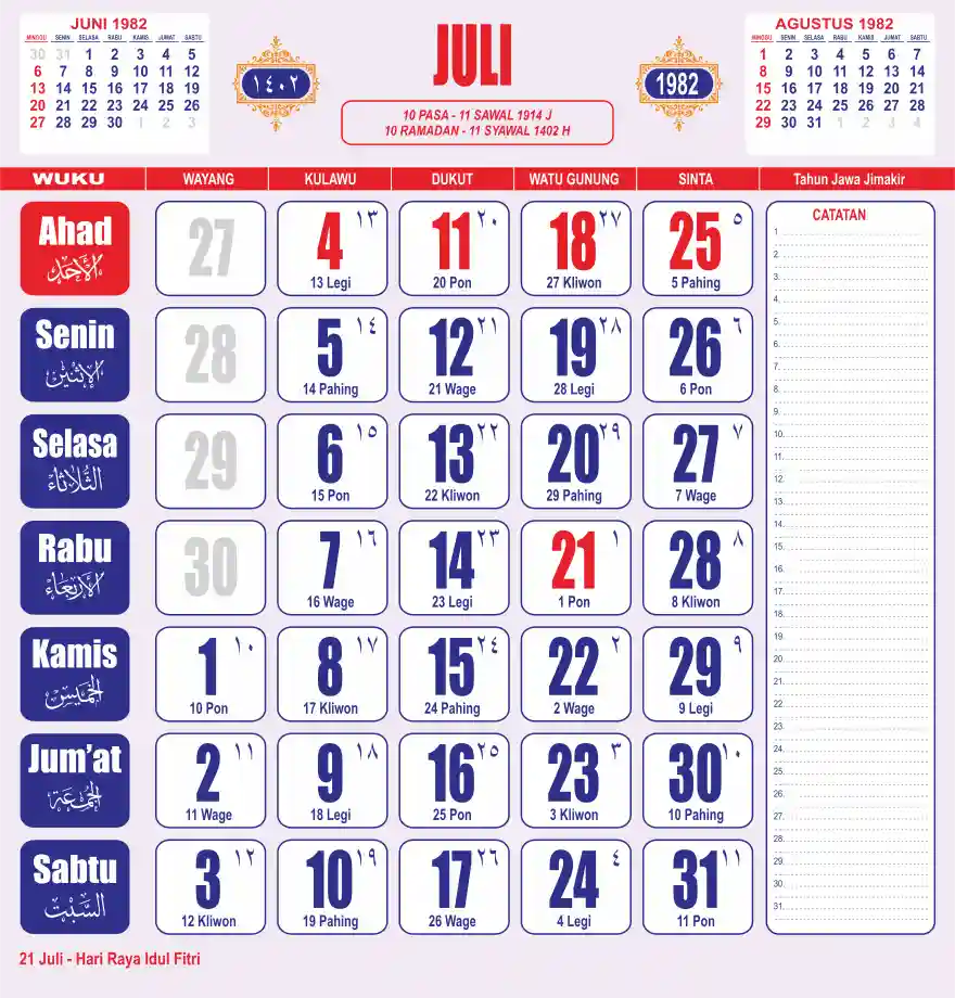 Template kalender 1982 lembaran besar jumbo yang sering dipakai oleh masyarakat jawa lengkap dengan wuku. Kalender ini biasanya di cetak 1 lembar per bulan.