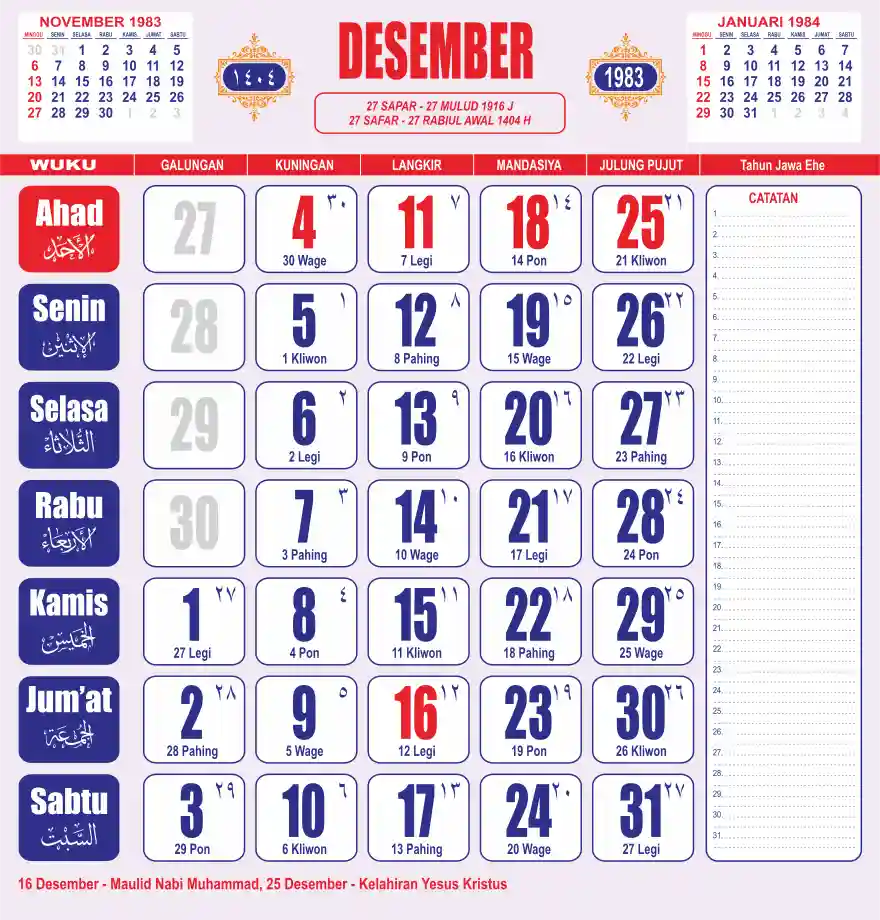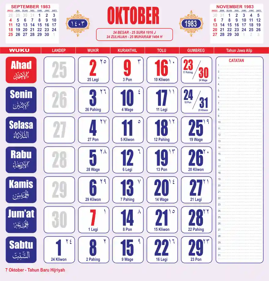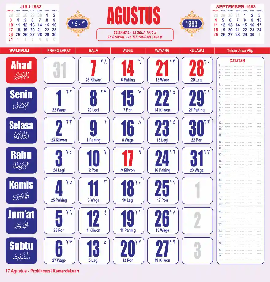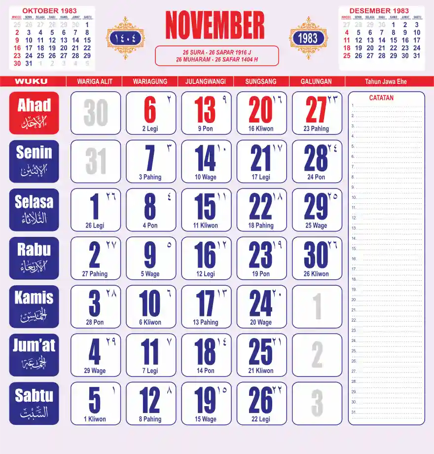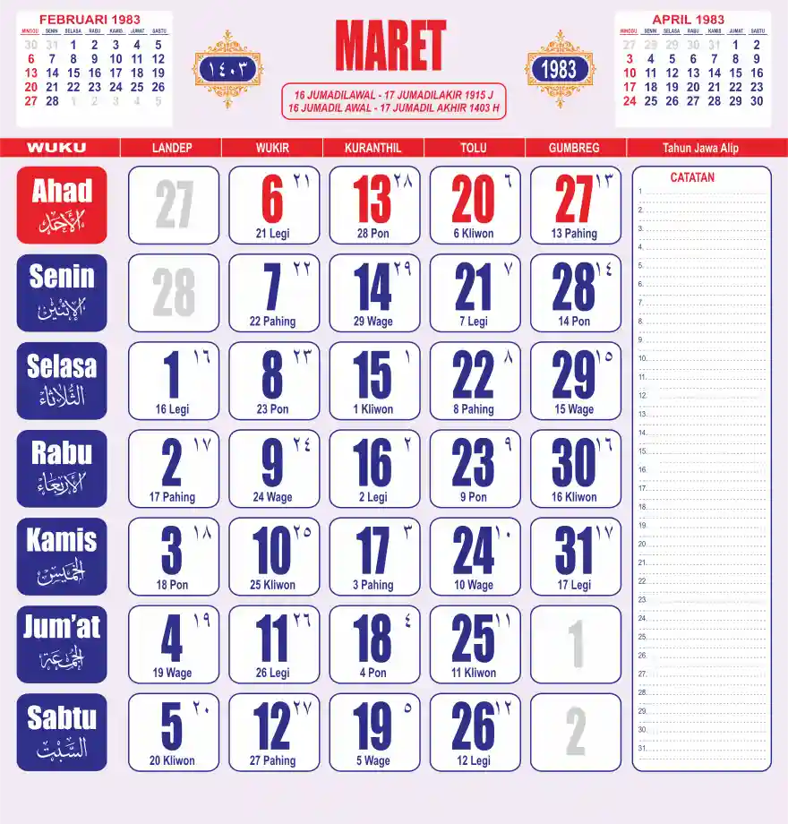 Template kalender 1983 lembaran besar jumbo yang sering dipakai oleh masyarakat jawa lengkap dengan wuku. Kalender ini biasanya di cetak 1 lembar per bulan.