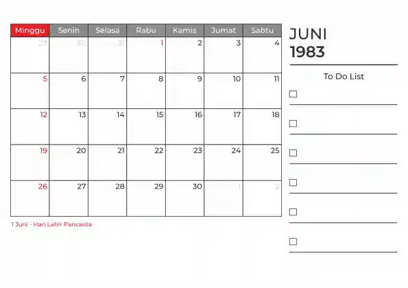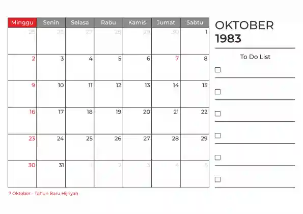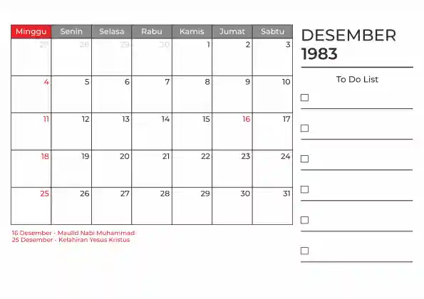 Template kalender 1983 duduk planner. Ada space kosong yang bisa di isi untuk menulis catatan dan ada space untuk menulis to do list.