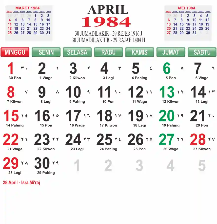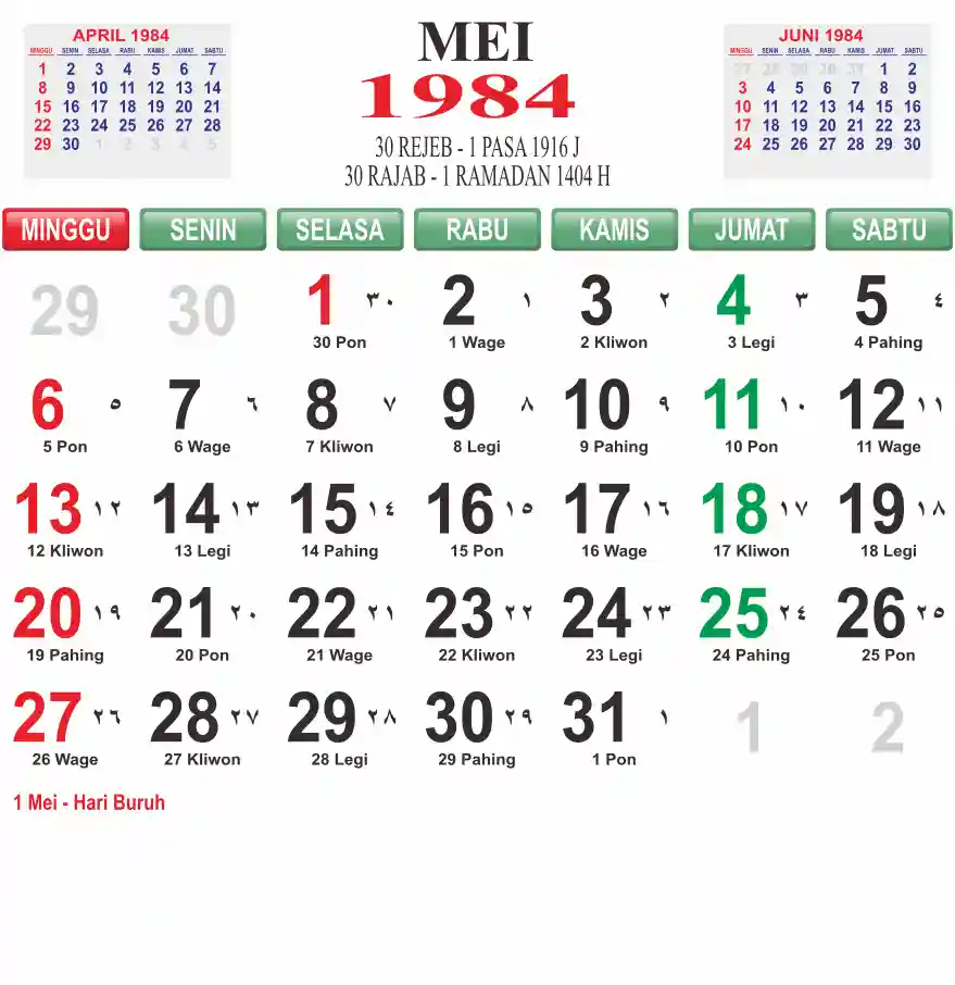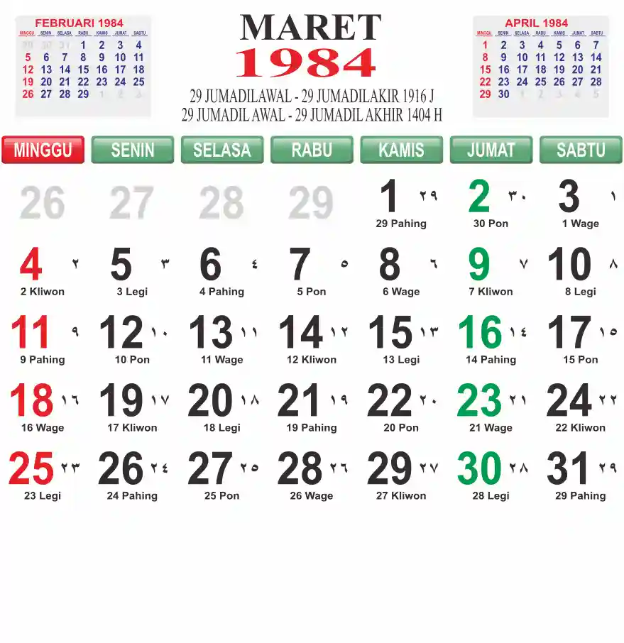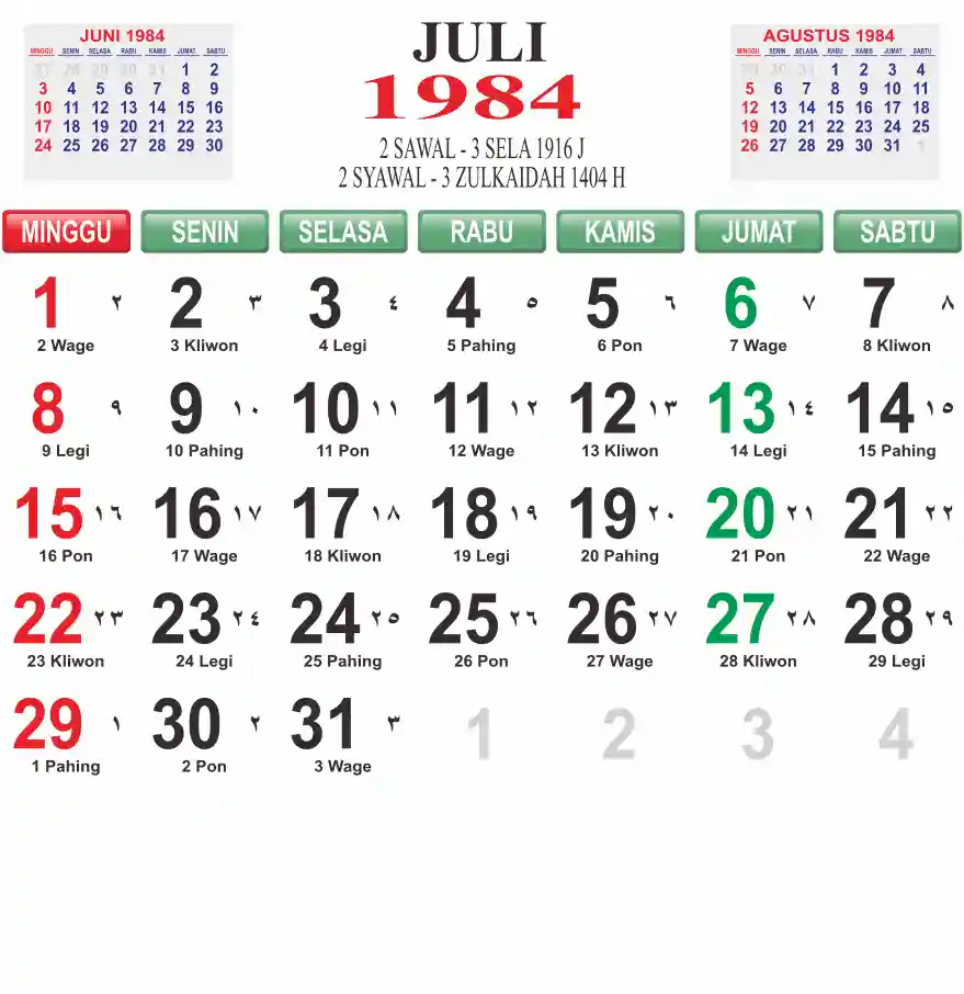 Template kalender 1984 lembaran besar jumbo yang mudah di baca dari jarak jauh. Kalender ini biasanya di cetak 1 lembar per bulan.