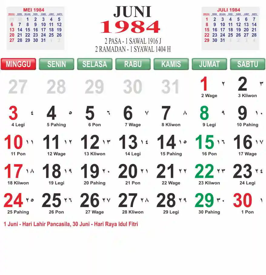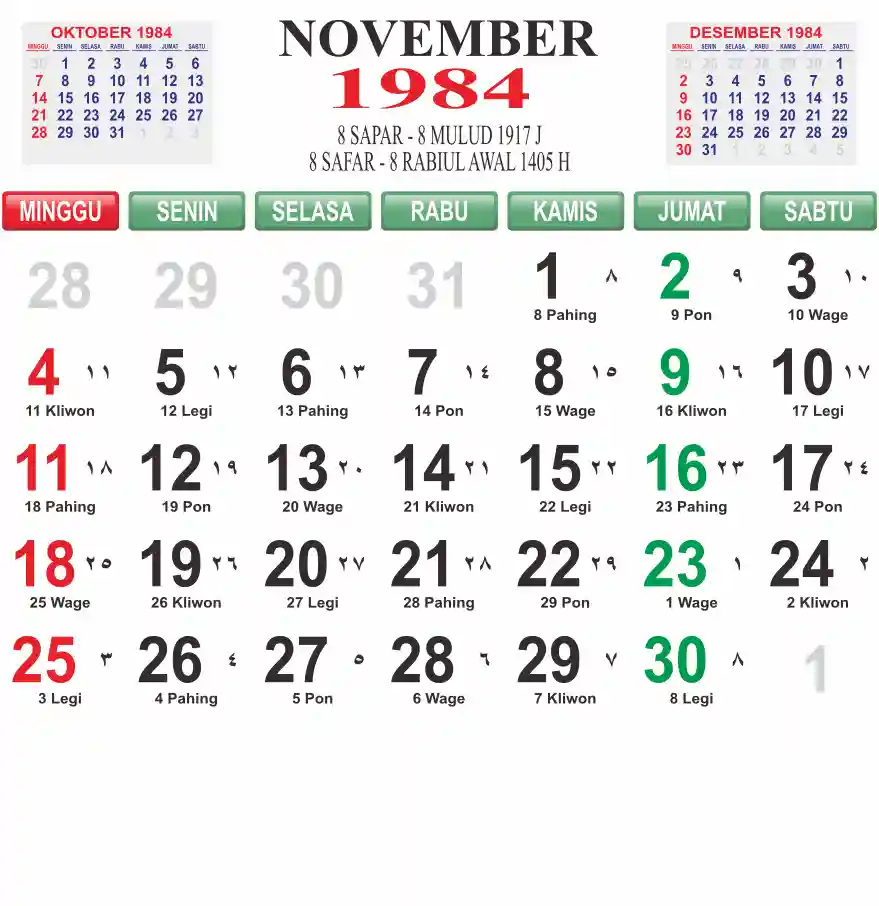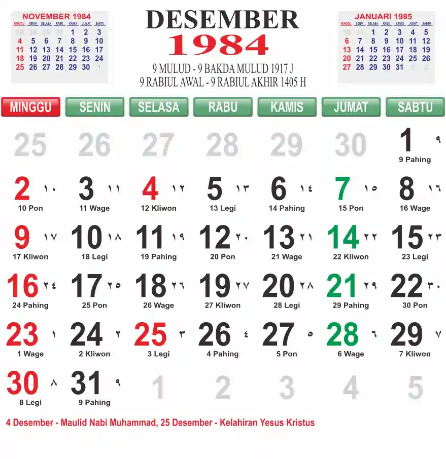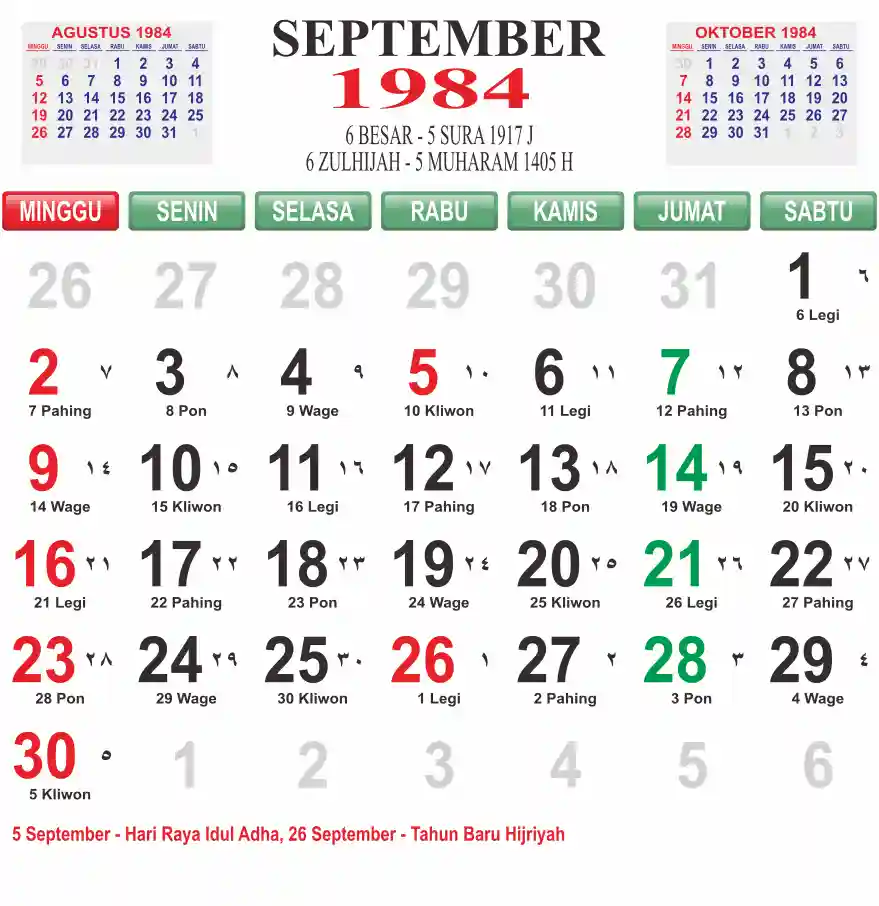 Template kalender 1984 lembaran besar jumbo yang mudah di baca dari jarak jauh. Kalender ini biasanya di cetak 1 lembar per bulan.