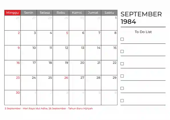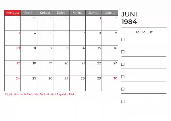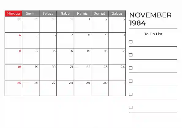Template kalender 1984 duduk planner. Ada space kosong yang bisa di isi untuk menulis catatan dan ada space untuk menulis to do list.