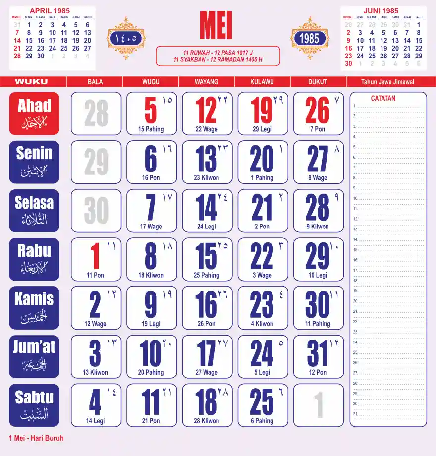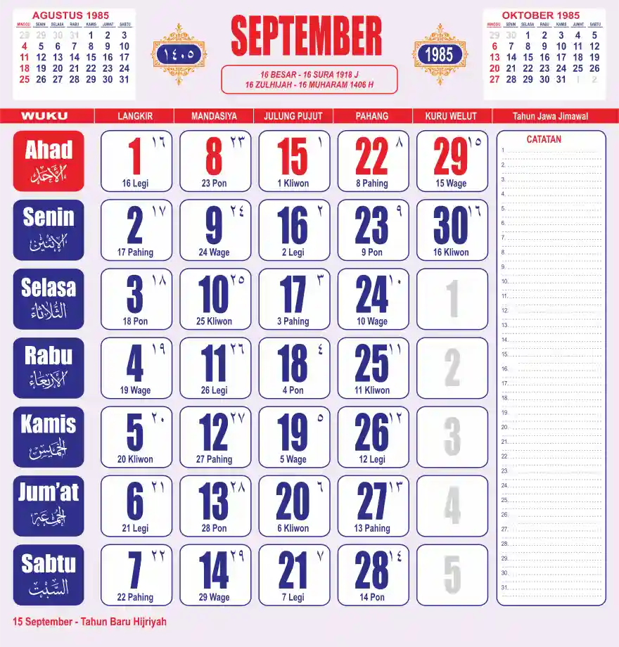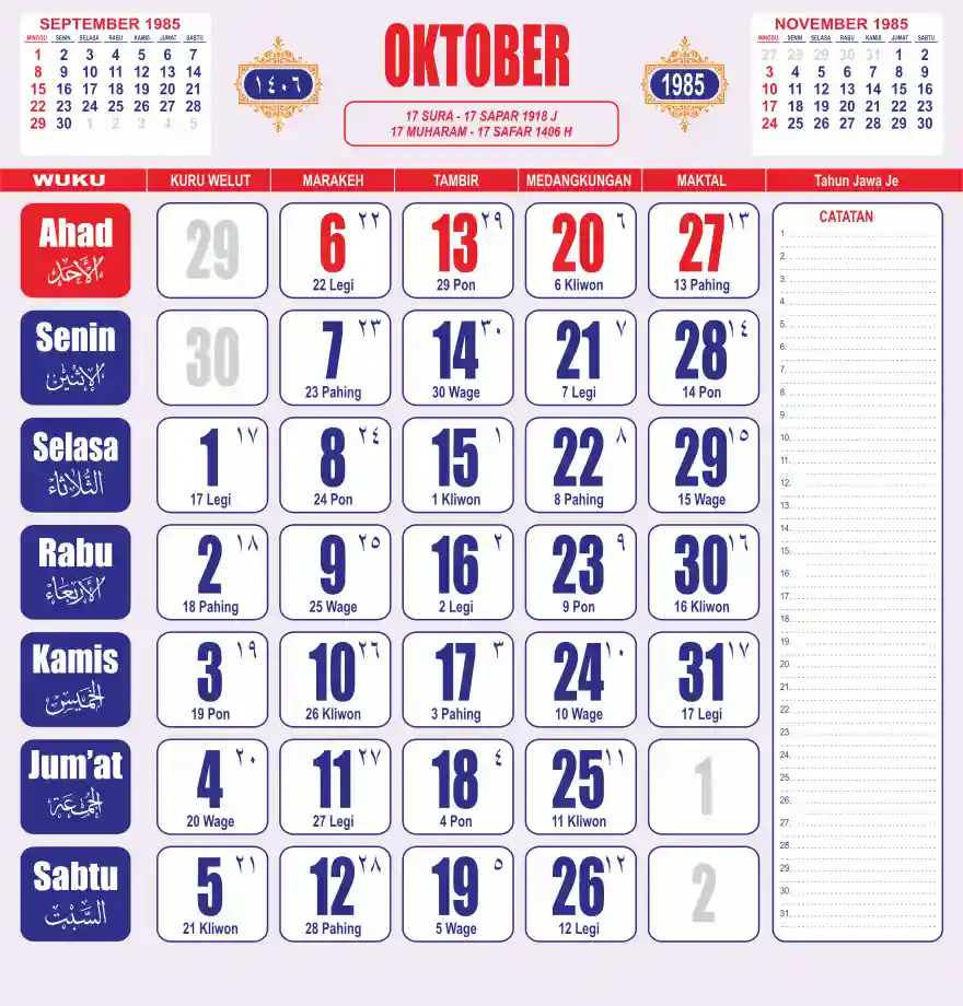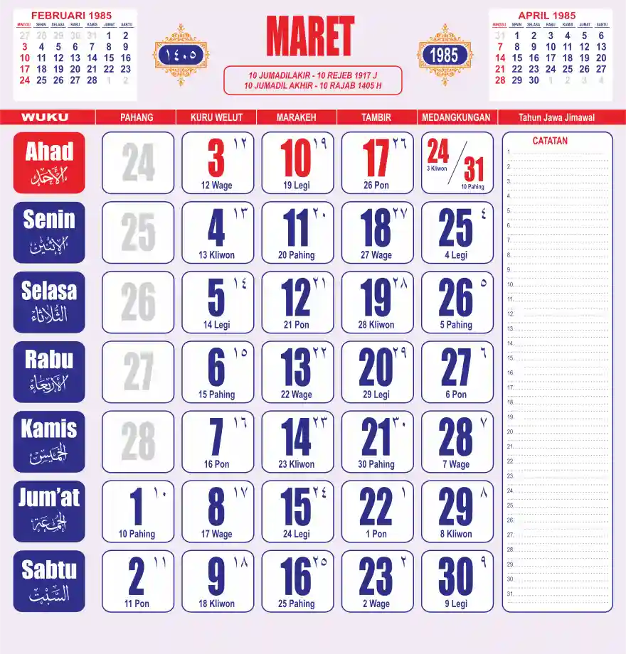 Template kalender 1985 lembaran besar jumbo yang sering dipakai oleh masyarakat jawa lengkap dengan wuku. Kalender ini biasanya di cetak 1 lembar per bulan.