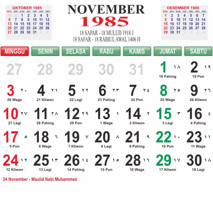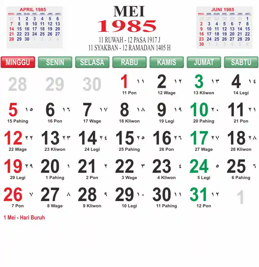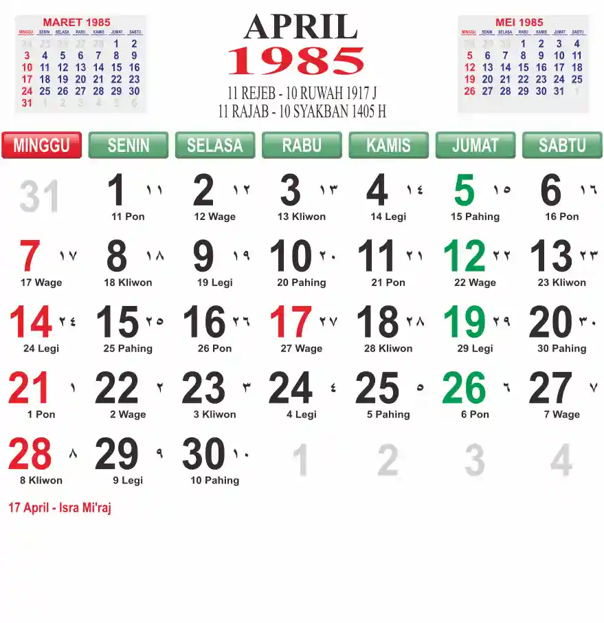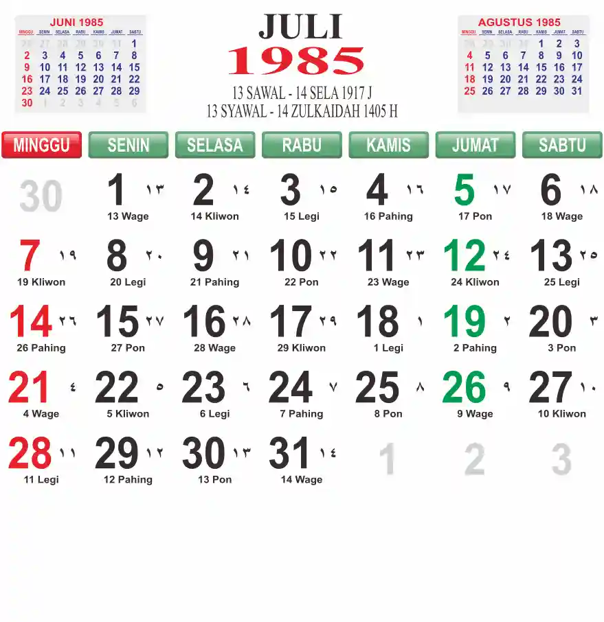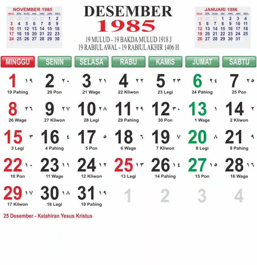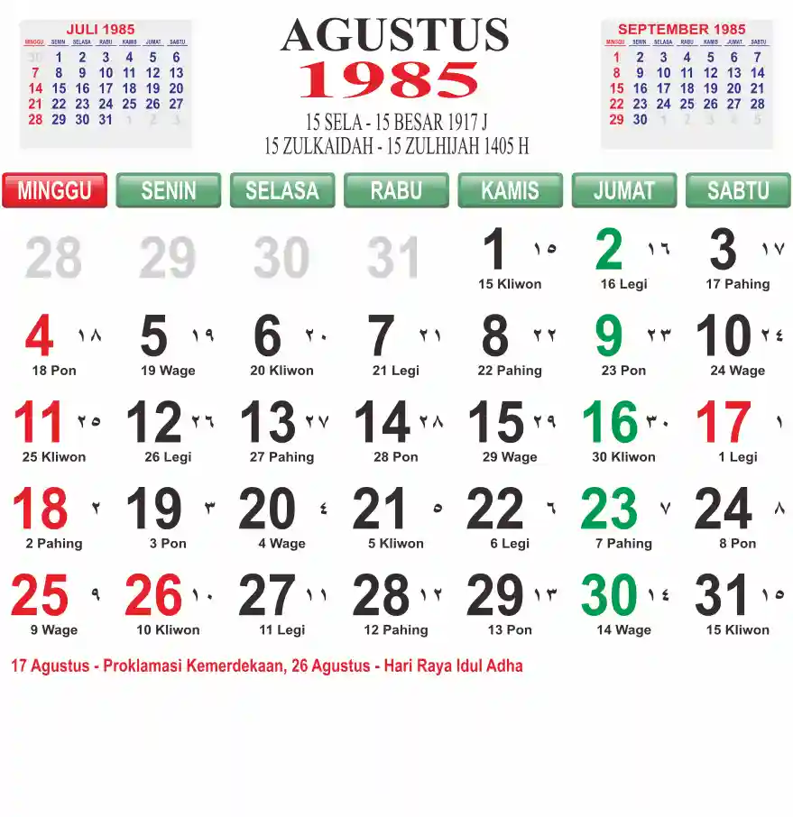 Template kalender 1985 lembaran besar jumbo yang mudah di baca dari jarak jauh. Kalender ini biasanya di cetak 1 lembar per bulan.