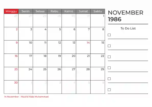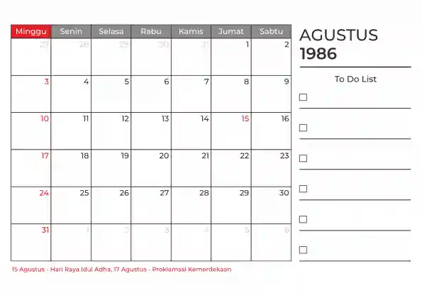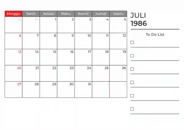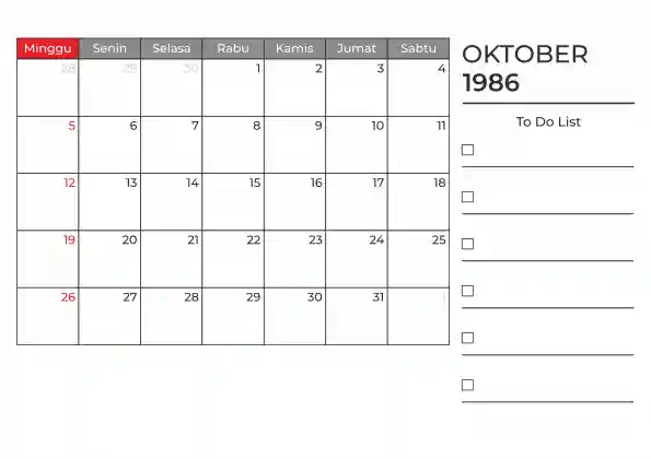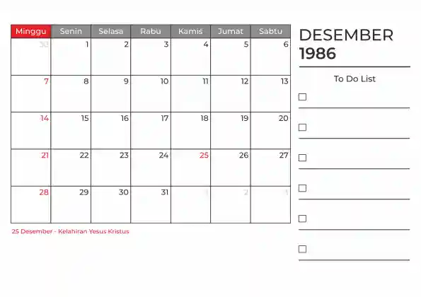 Template kalender 1986 duduk planner. Ada space kosong yang bisa di isi untuk menulis catatan dan ada space untuk menulis to do list.