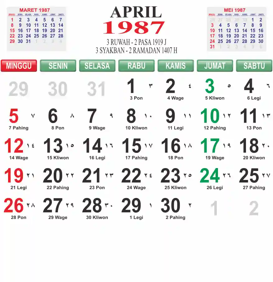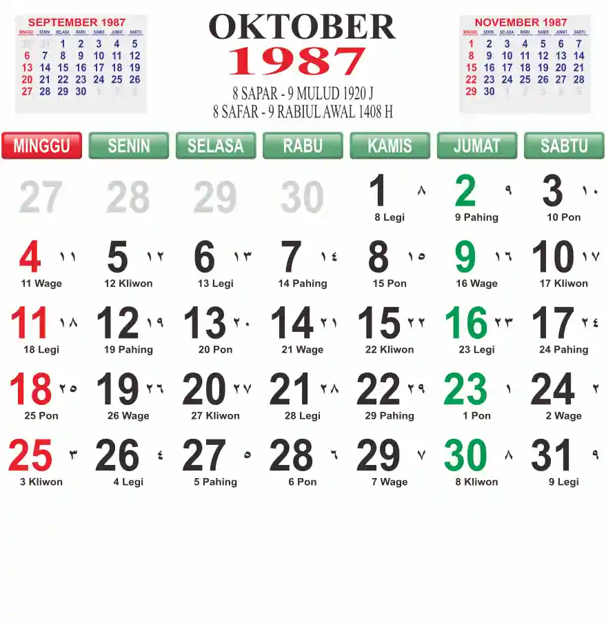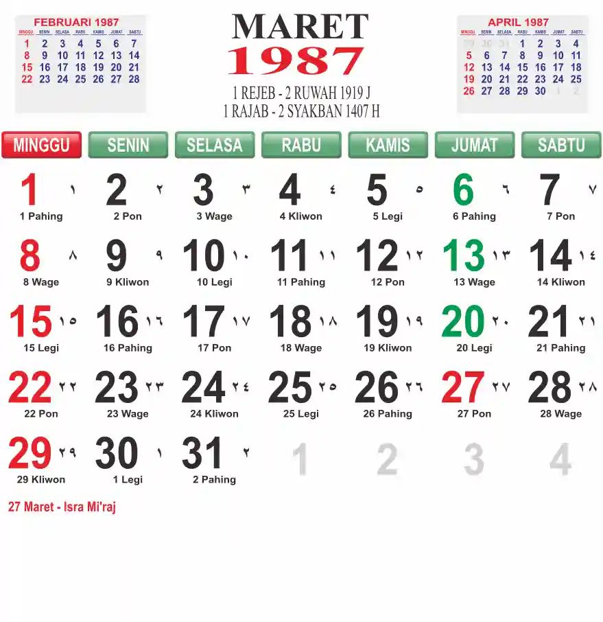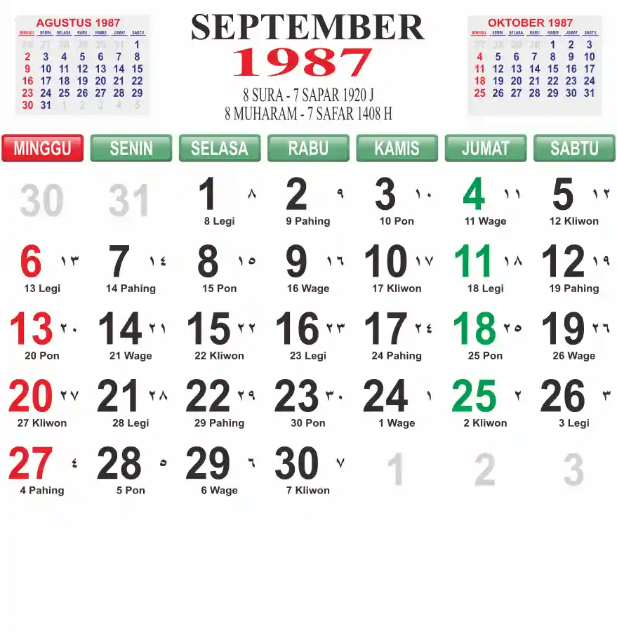 Template kalender 1987 lembaran besar jumbo yang mudah di baca dari jarak jauh. Kalender ini biasanya di cetak 1 lembar per bulan.
