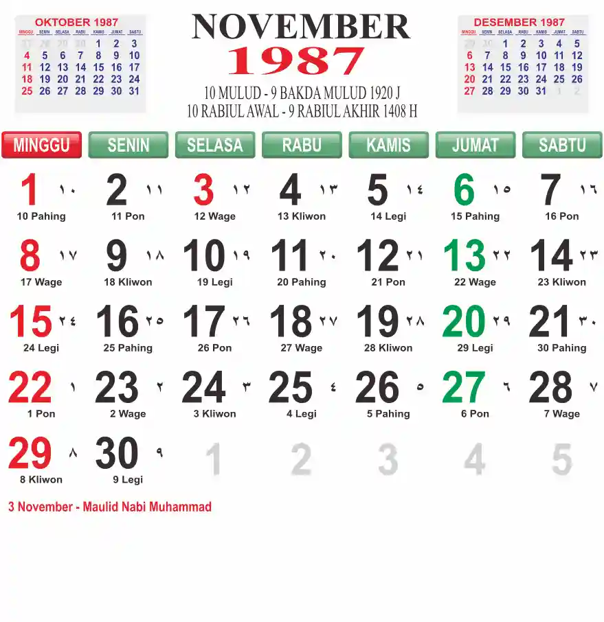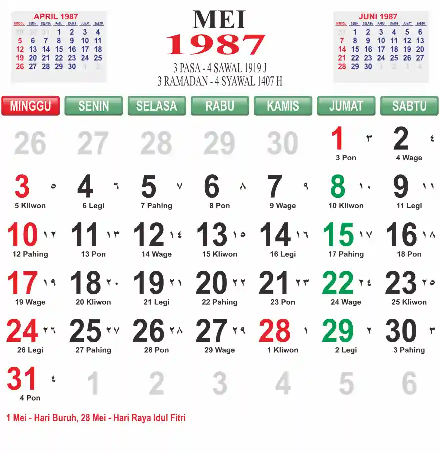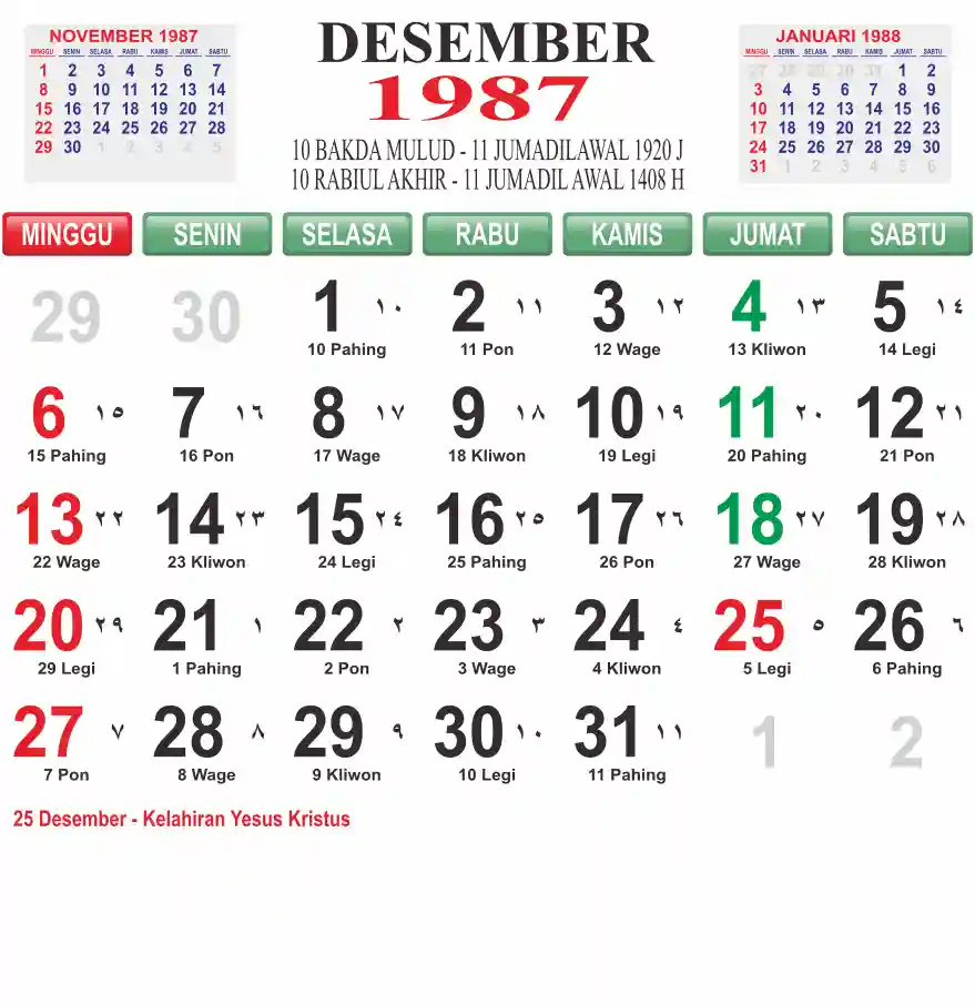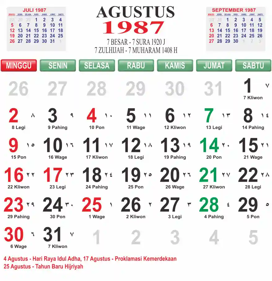Template kalender 1987 lembaran besar jumbo yang mudah di baca dari jarak jauh. Kalender ini biasanya di cetak 1 lembar per bulan.