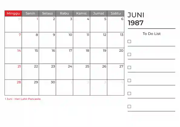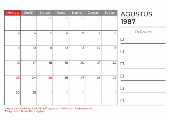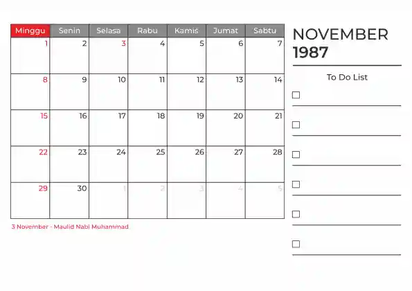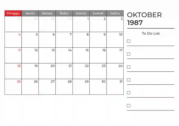 Template kalender 1987 duduk planner. Ada space kosong yang bisa di isi untuk menulis catatan dan ada space untuk menulis to do list.