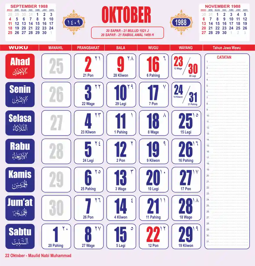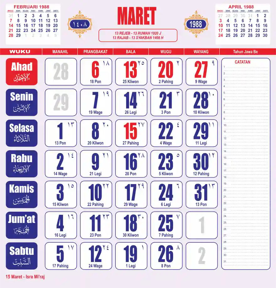Template kalender 1988 lembaran besar jumbo yang sering dipakai oleh masyarakat jawa lengkap dengan wuku. Kalender ini biasanya di cetak 1 lembar per bulan.