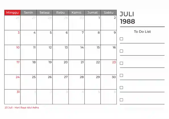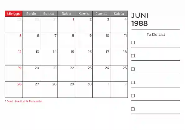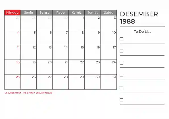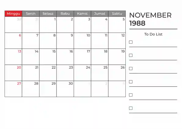 Template kalender 1988 duduk planner. Ada space kosong yang bisa di isi untuk menulis catatan dan ada space untuk menulis to do list.