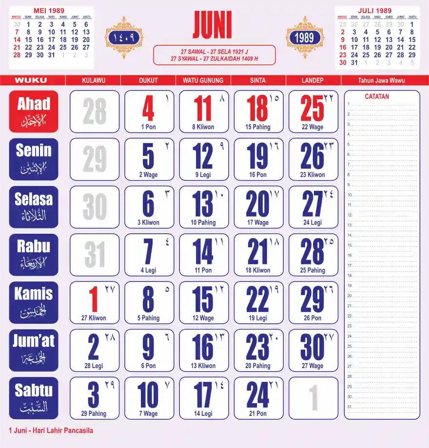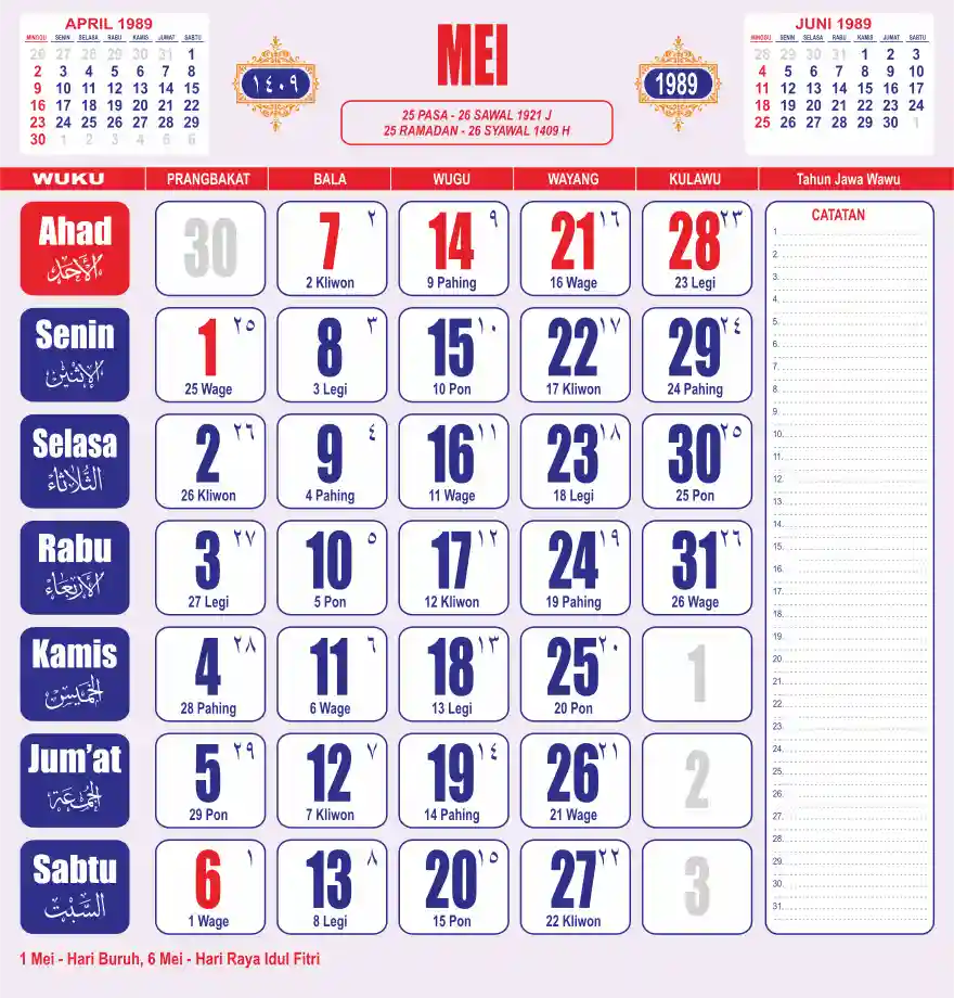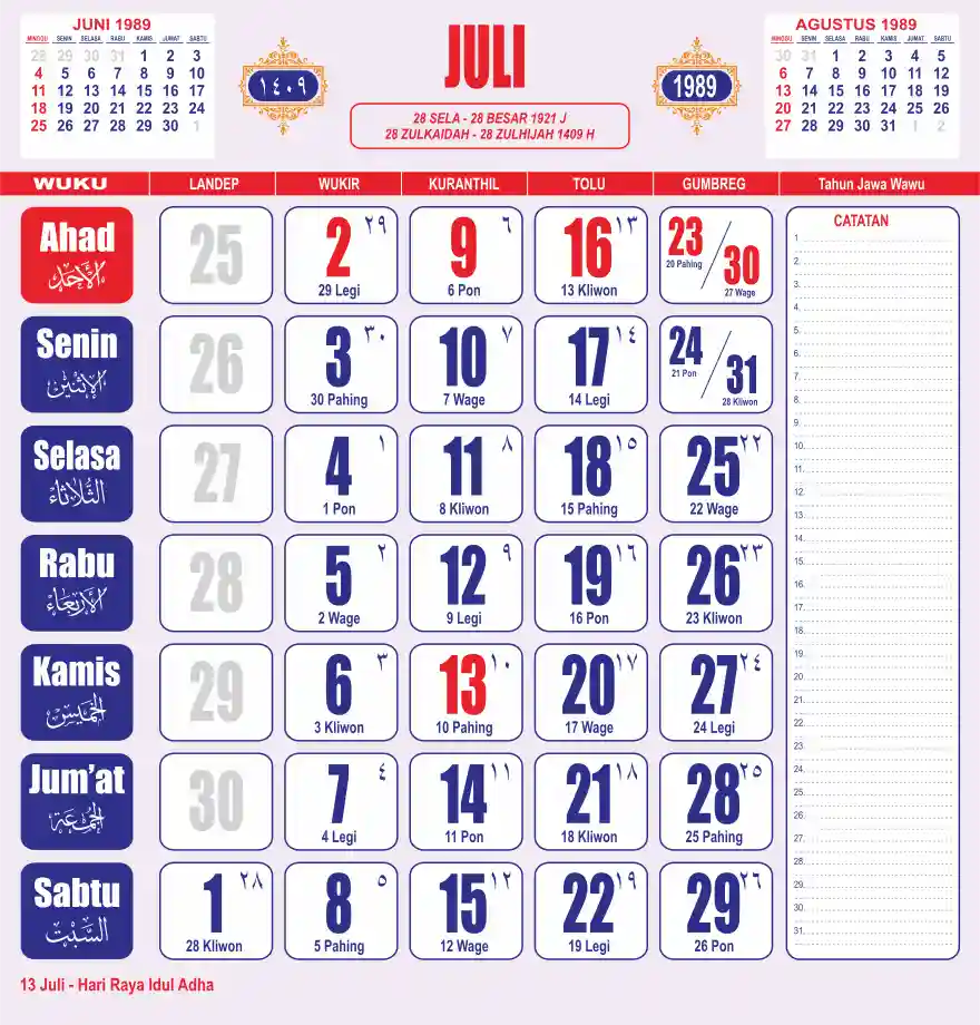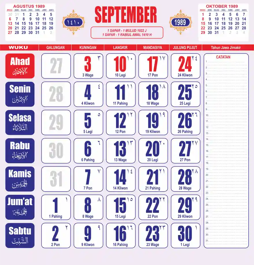 Template kalender 1989 lembaran besar jumbo yang sering dipakai oleh masyarakat jawa lengkap dengan wuku. Kalender ini biasanya di cetak 1 lembar per bulan.