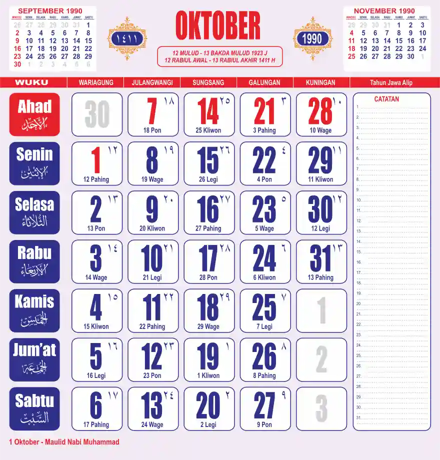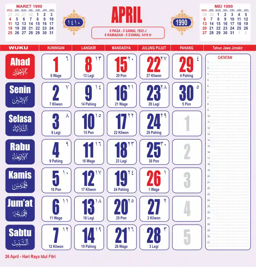 Template kalender 1990 lembaran besar jumbo yang sering dipakai oleh masyarakat jawa lengkap dengan wuku. Kalender ini biasanya di cetak 1 lembar per bulan.