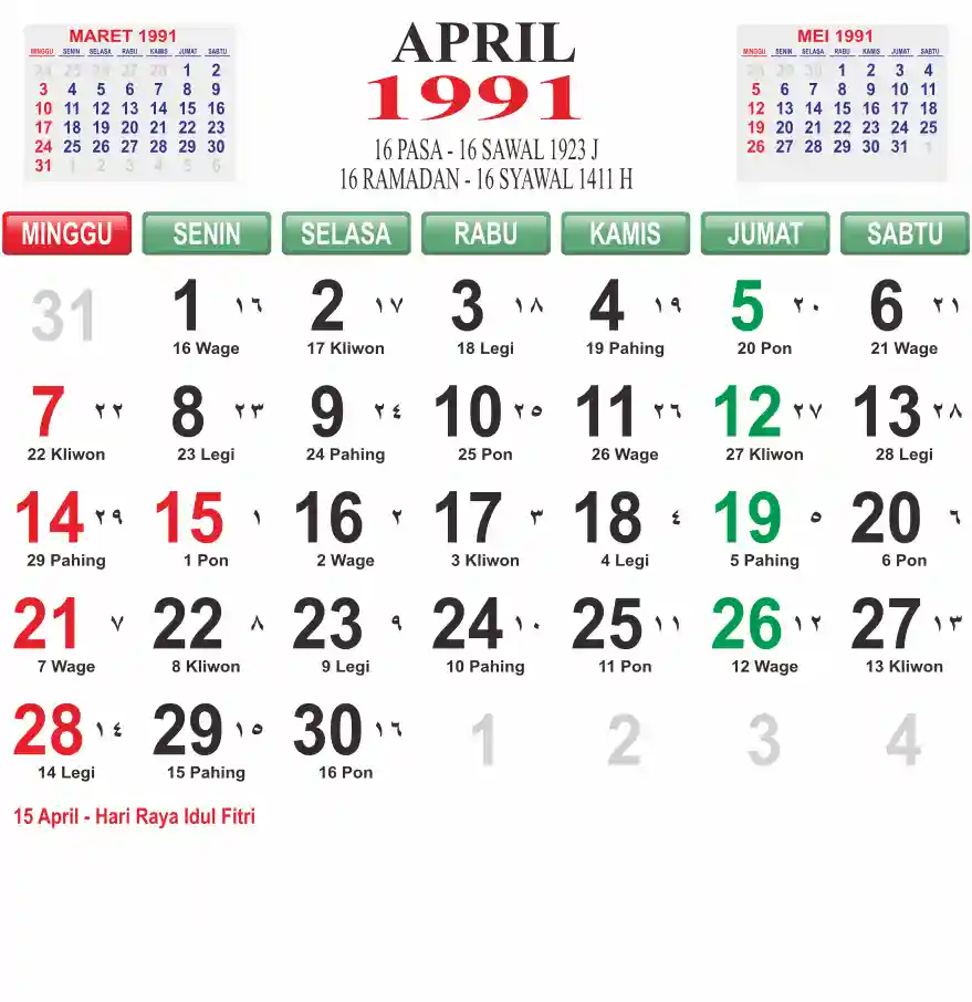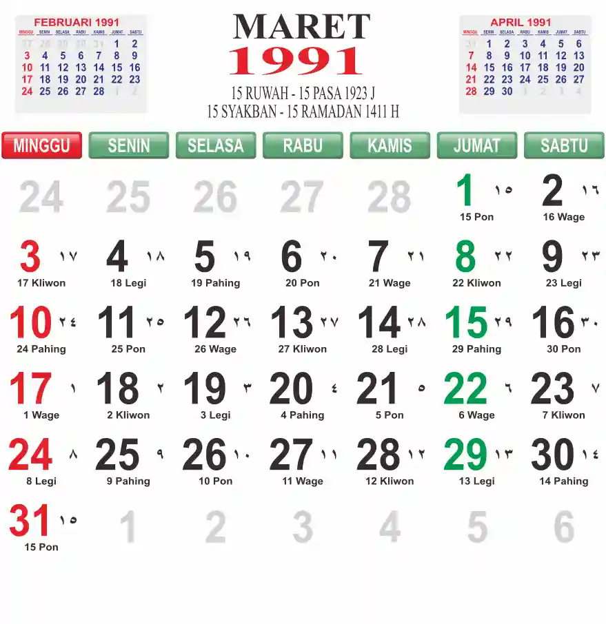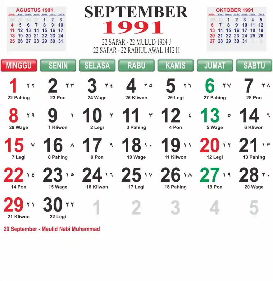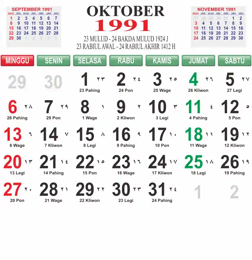 Template kalender 1991 lembaran besar jumbo yang mudah di baca dari jarak jauh. Kalender ini biasanya di cetak 1 lembar per bulan.