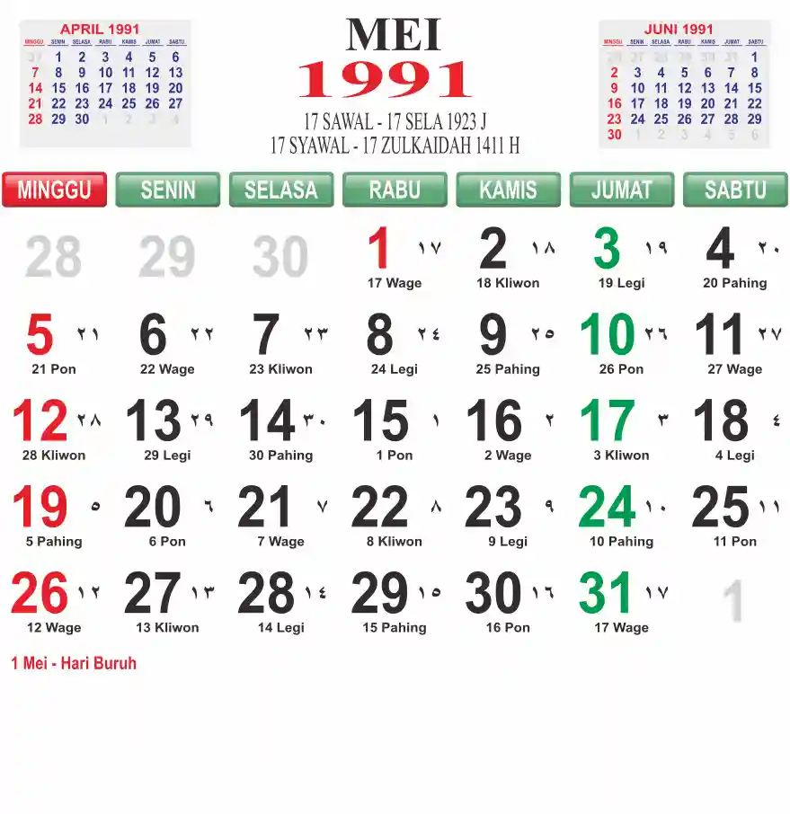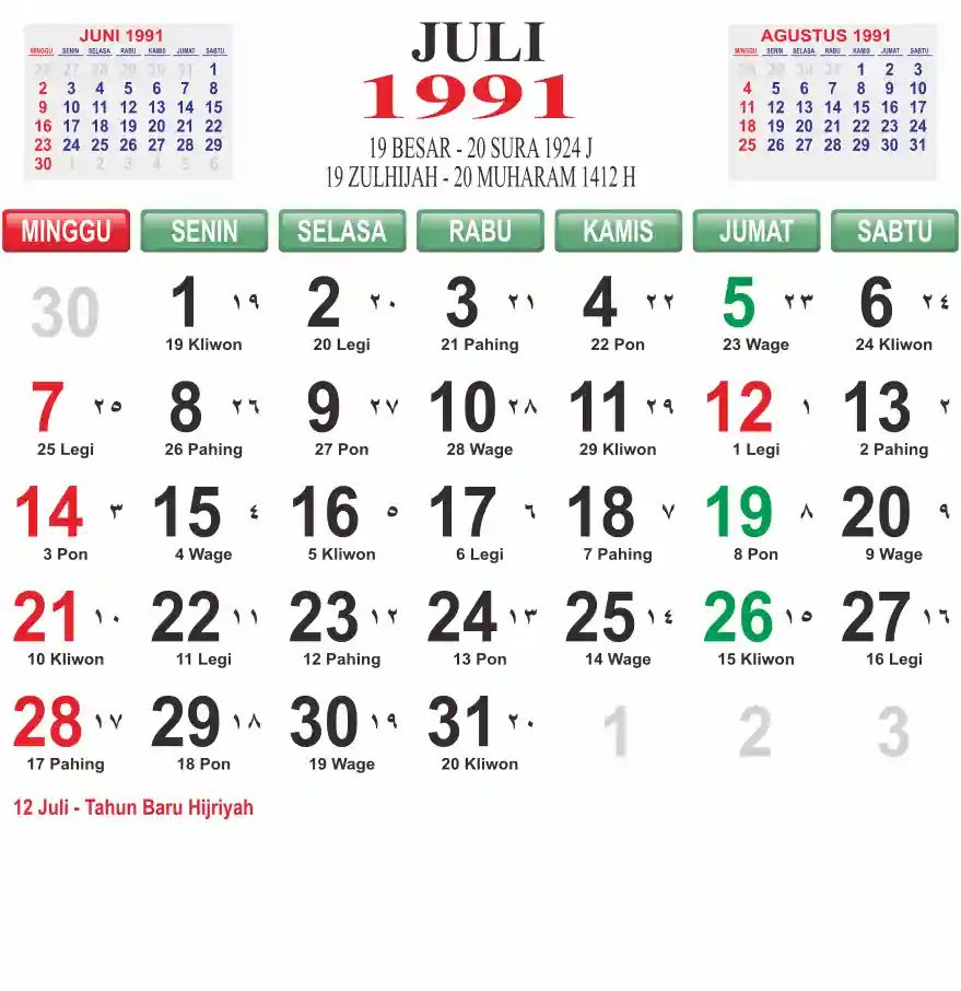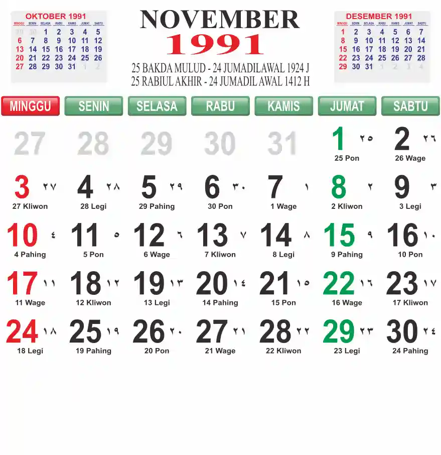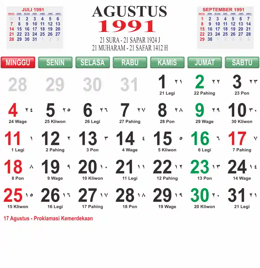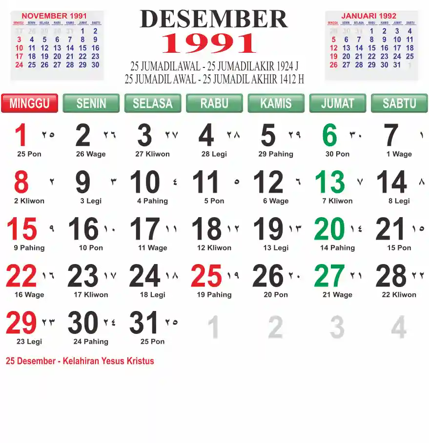 Template kalender 1991 lembaran besar jumbo yang mudah di baca dari jarak jauh. Kalender ini biasanya di cetak 1 lembar per bulan.
