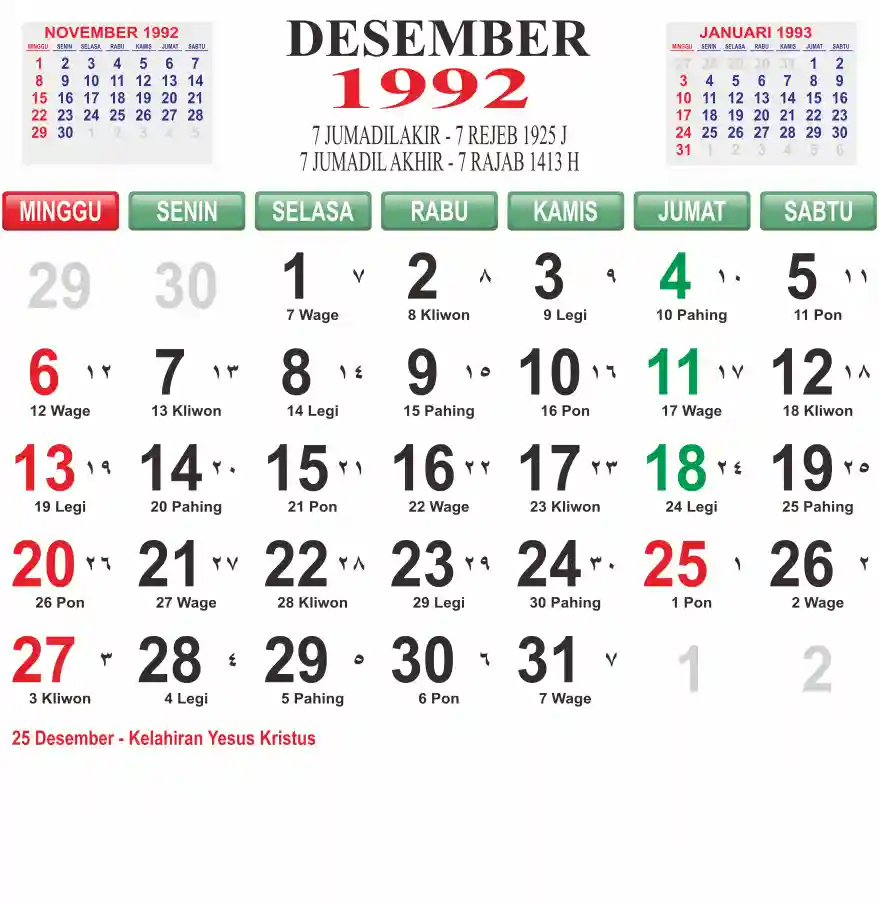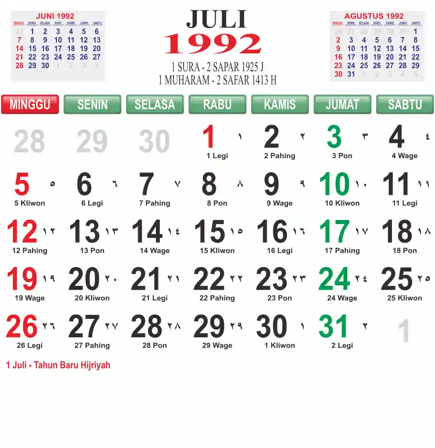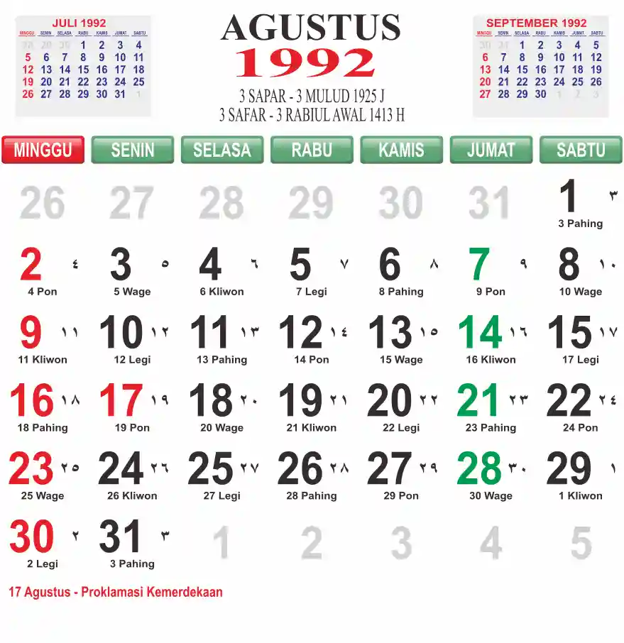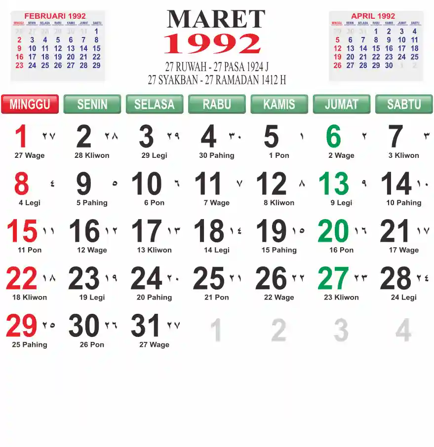 Template kalender 1992 lembaran besar jumbo yang mudah di baca dari jarak jauh. Kalender ini biasanya di cetak 1 lembar per bulan.