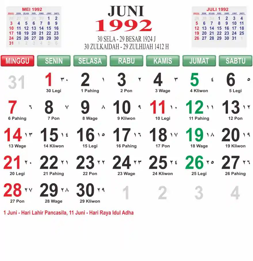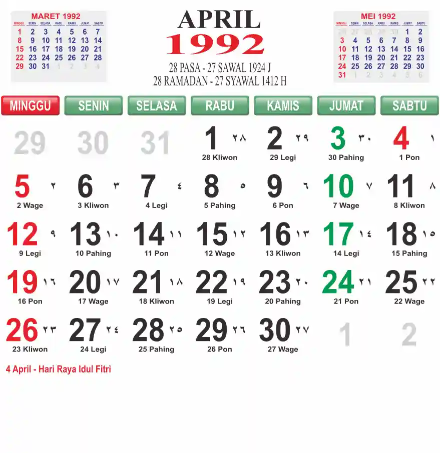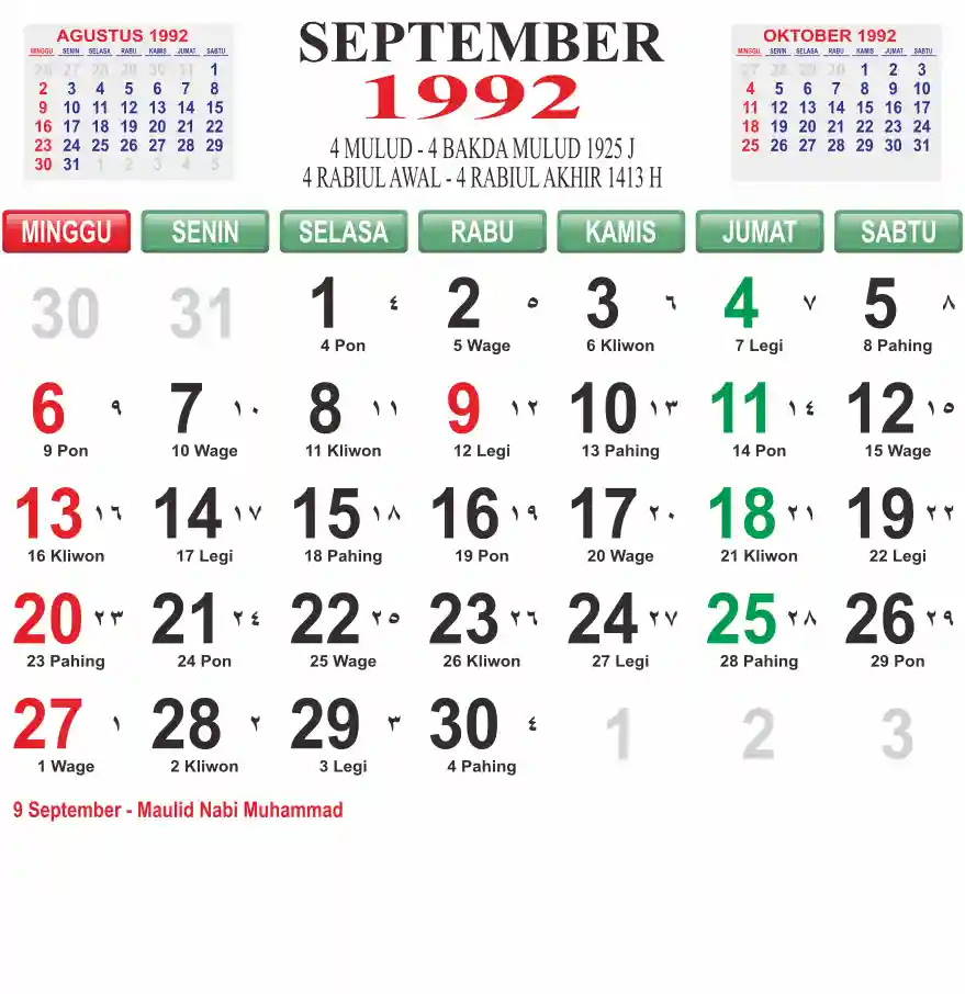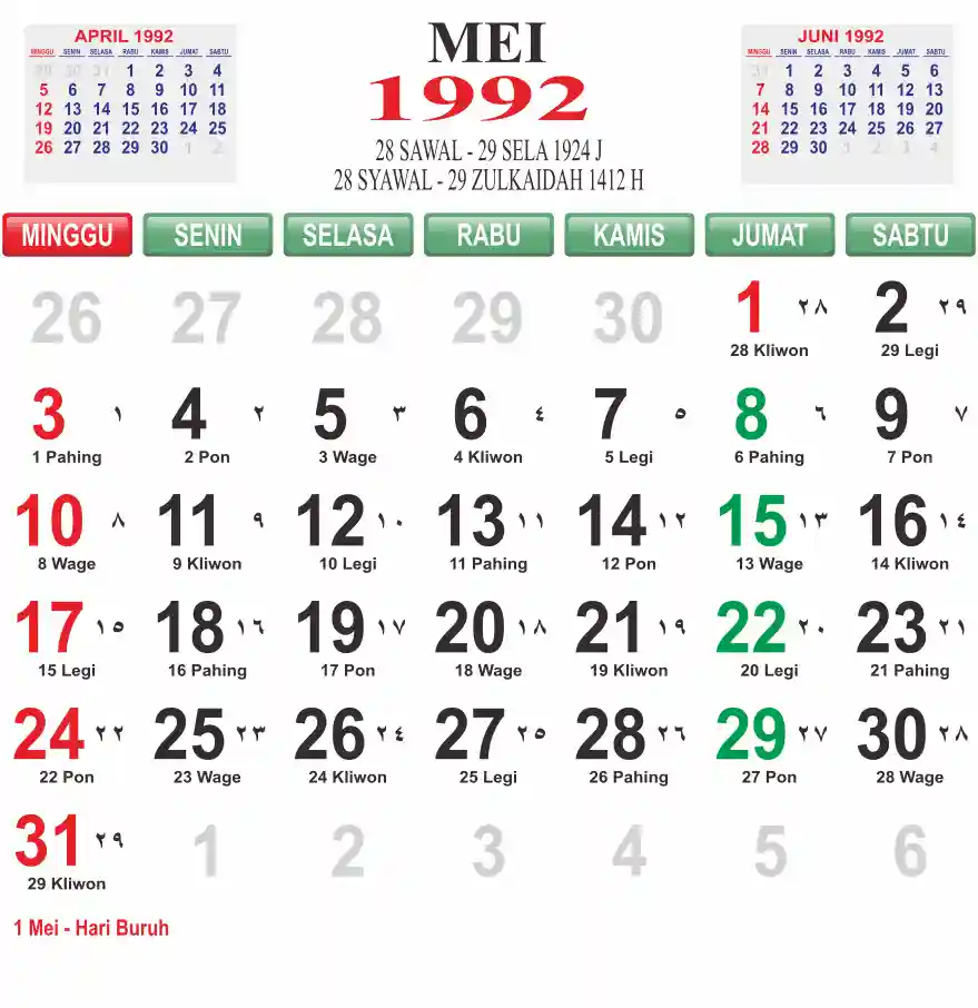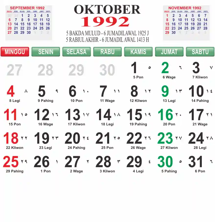 Template kalender 1992 lembaran besar jumbo yang mudah di baca dari jarak jauh. Kalender ini biasanya di cetak 1 lembar per bulan.