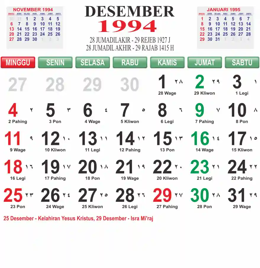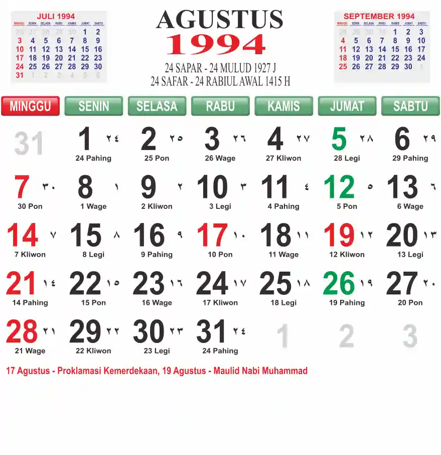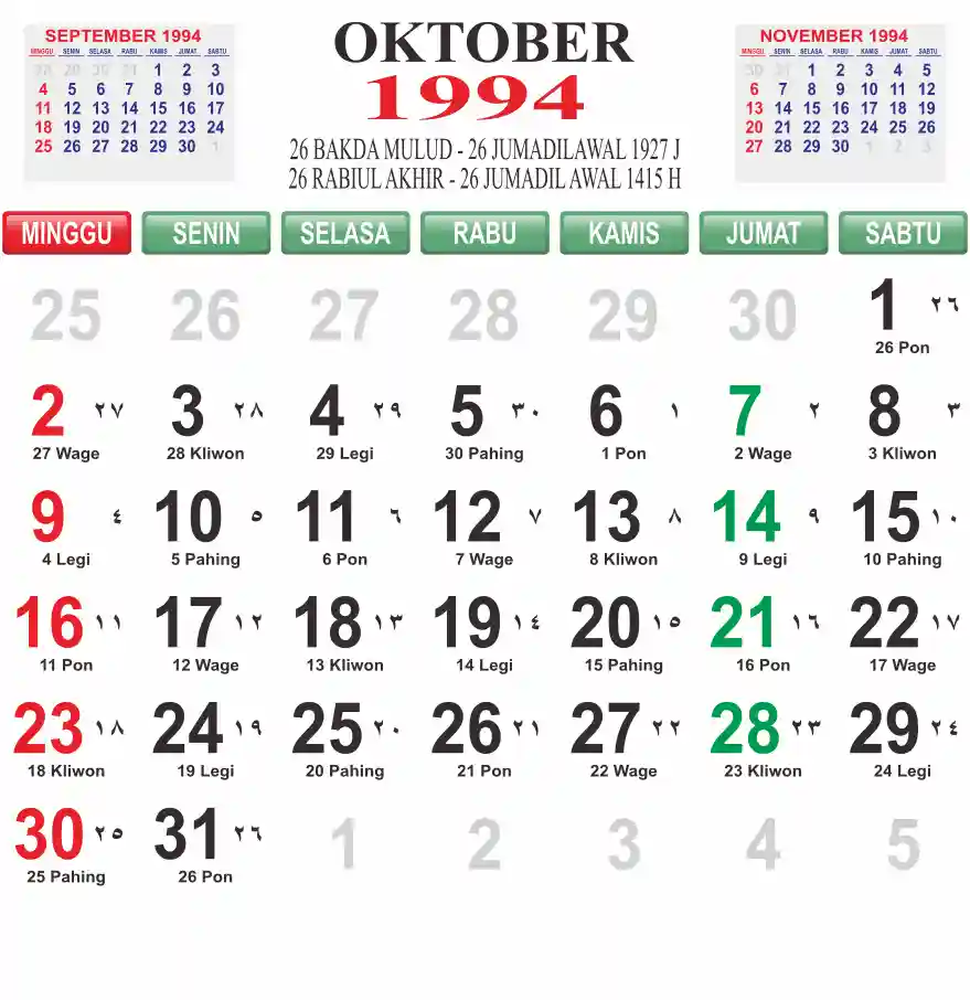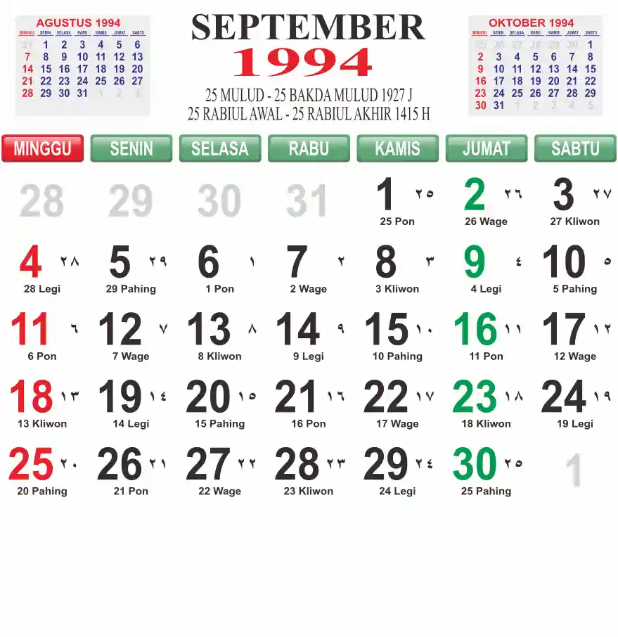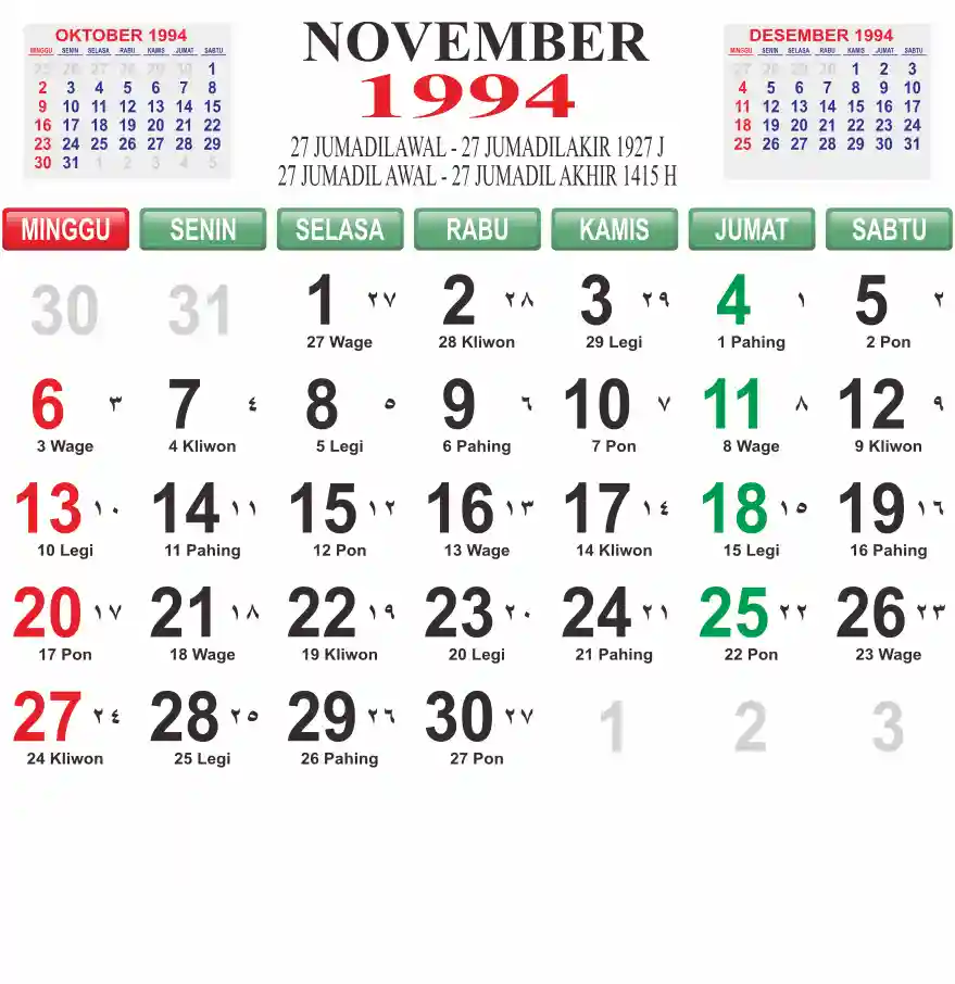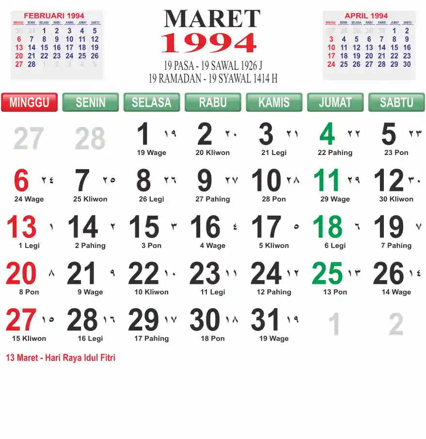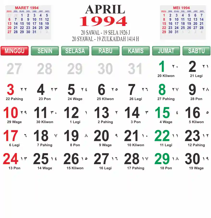 Template kalender 1994 lembaran besar jumbo yang mudah di baca dari jarak jauh. Kalender ini biasanya di cetak 1 lembar per bulan.