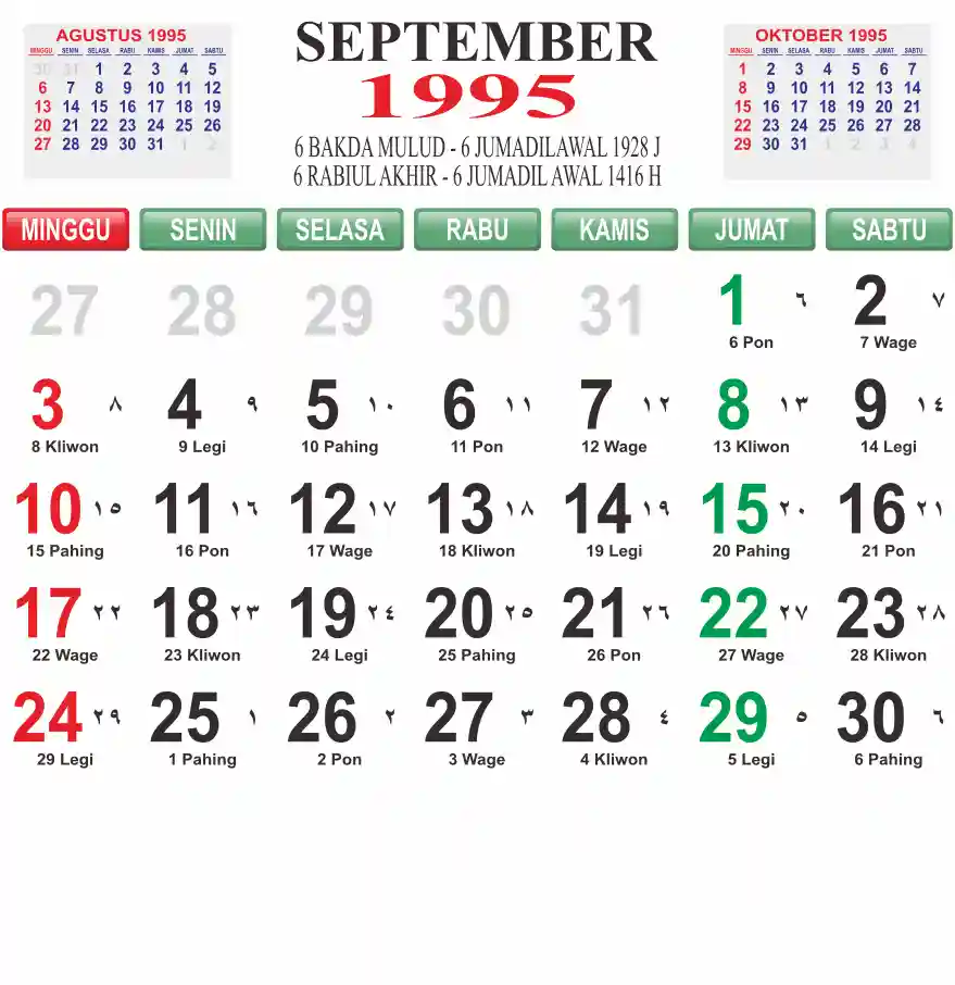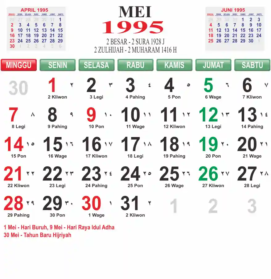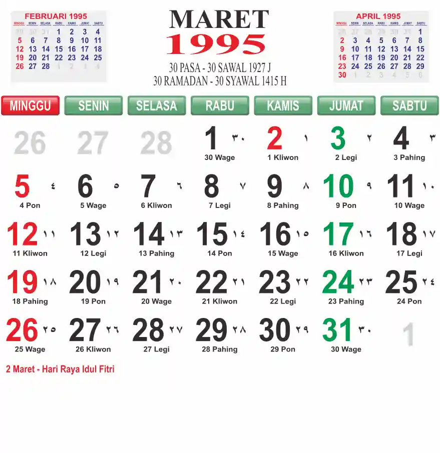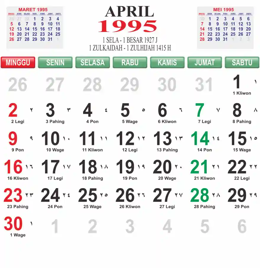 Template kalender 1995 lembaran besar jumbo yang mudah di baca dari jarak jauh. Kalender ini biasanya di cetak 1 lembar per bulan.