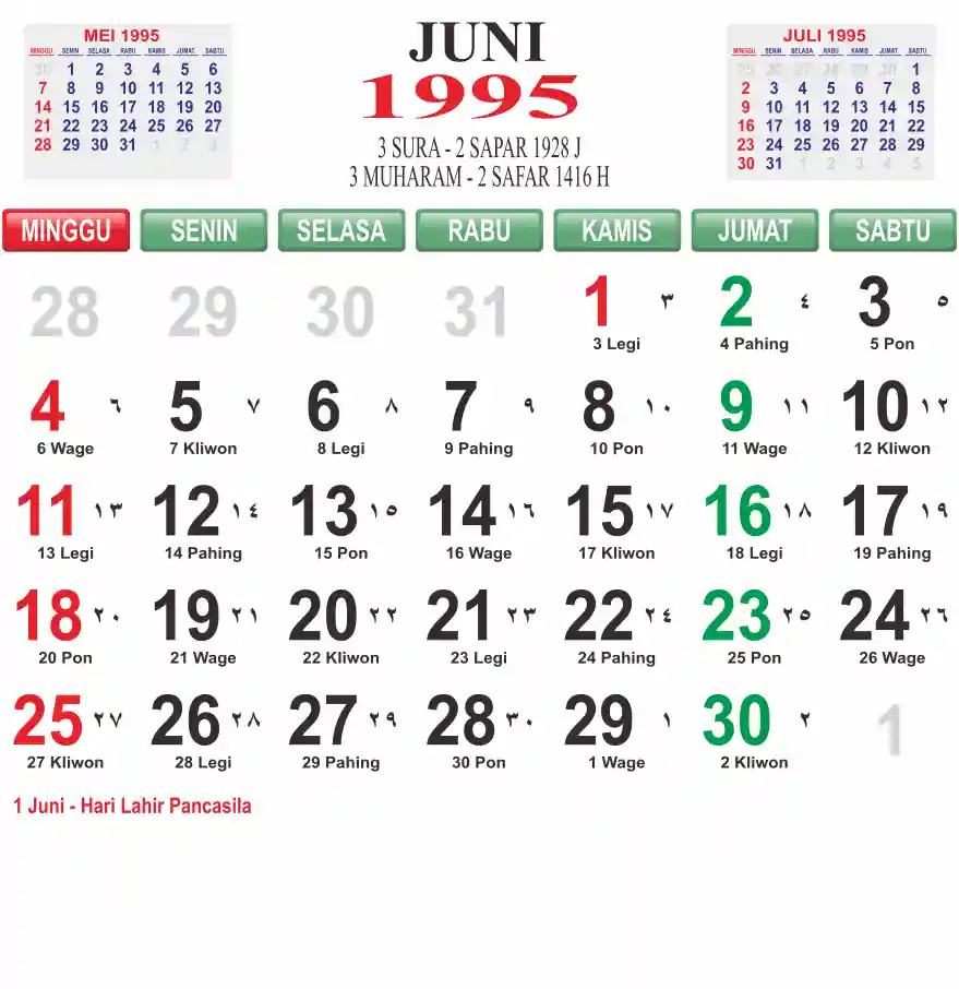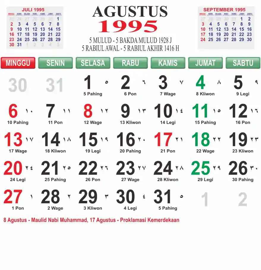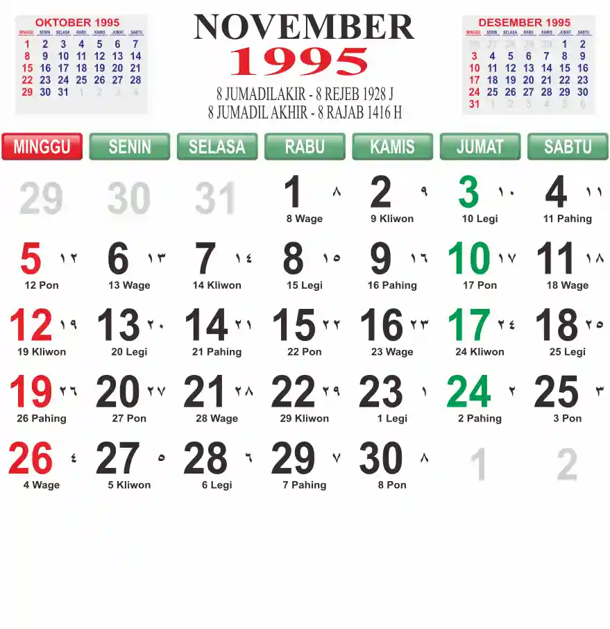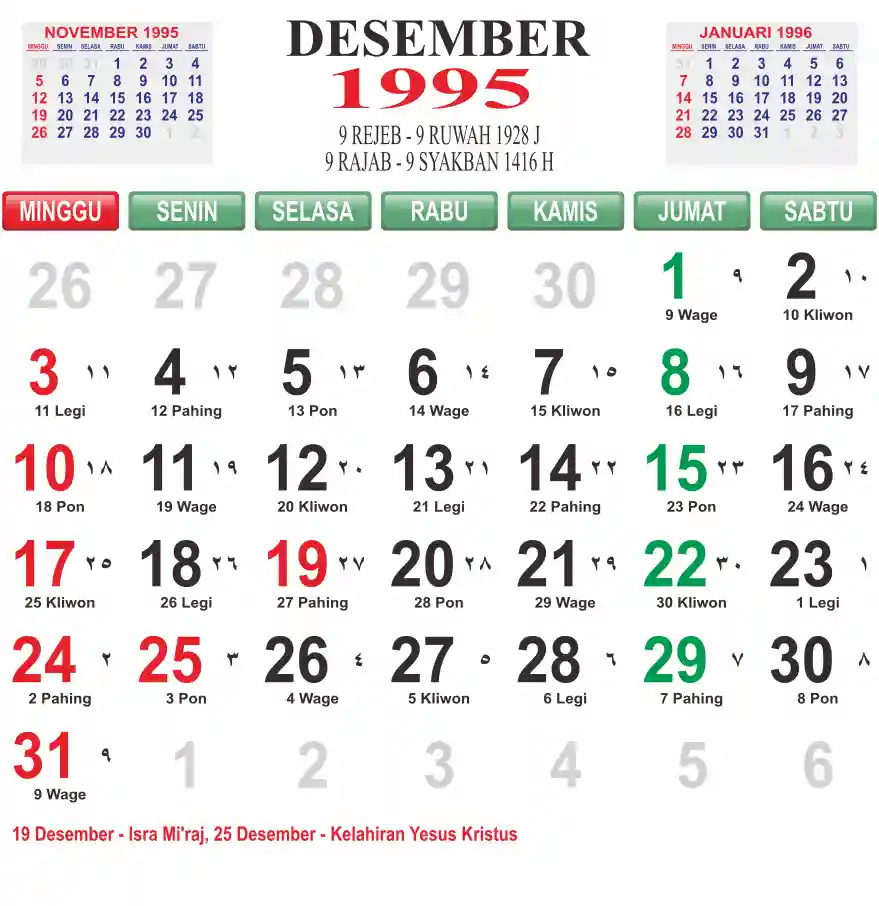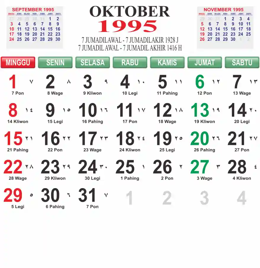 Template kalender 1995 lembaran besar jumbo yang mudah di baca dari jarak jauh. Kalender ini biasanya di cetak 1 lembar per bulan.