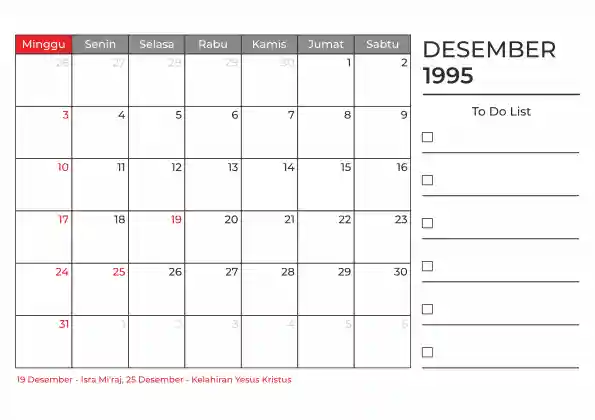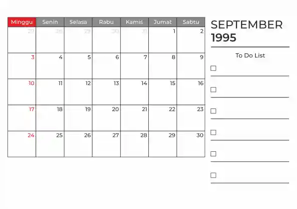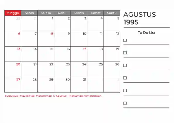 Template kalender 1995 duduk planner. Ada space kosong yang bisa di isi untuk menulis catatan dan ada space untuk menulis to do list.