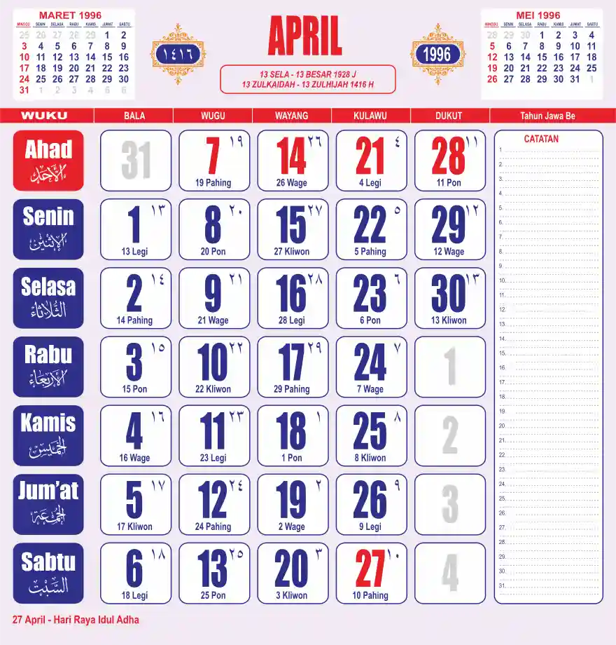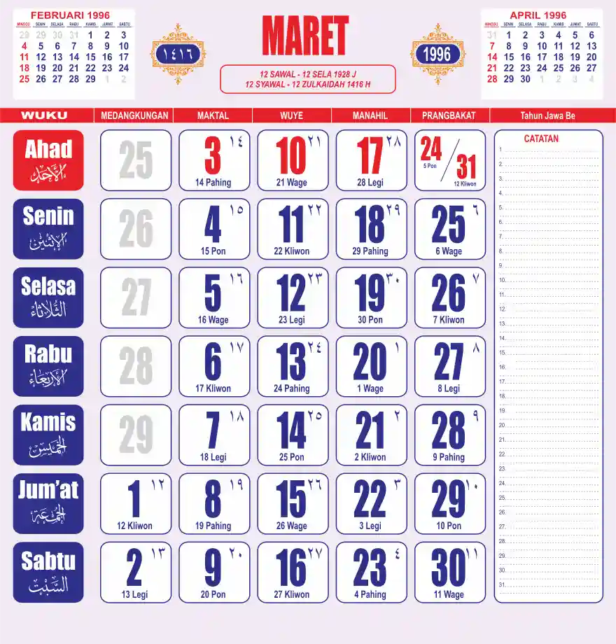 Template kalender 1996 lembaran besar jumbo yang sering dipakai oleh masyarakat jawa lengkap dengan wuku. Kalender ini biasanya di cetak 1 lembar per bulan.