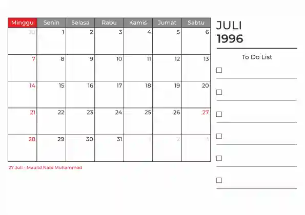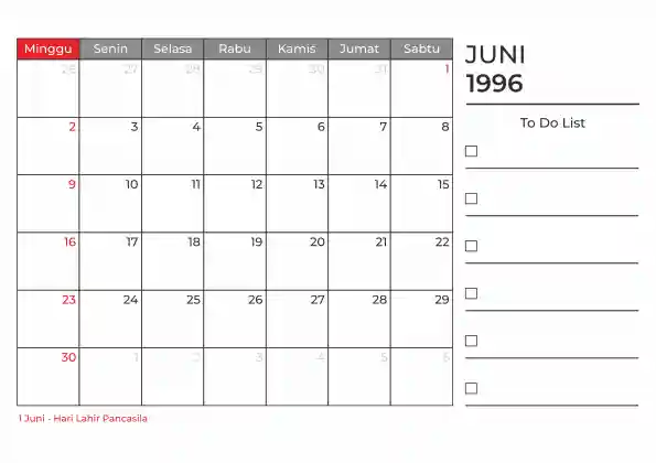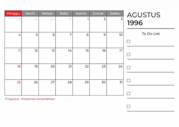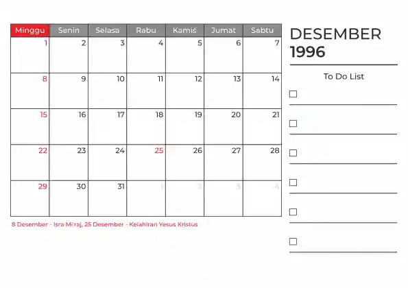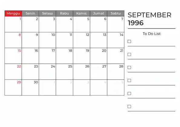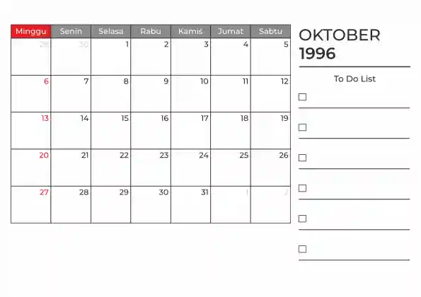 Template kalender 1996 duduk planner. Ada space kosong yang bisa di isi untuk menulis catatan dan ada space untuk menulis to do list.