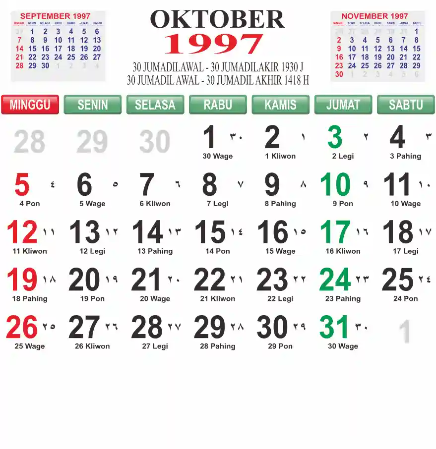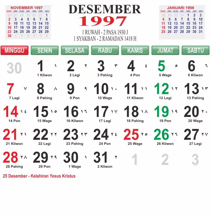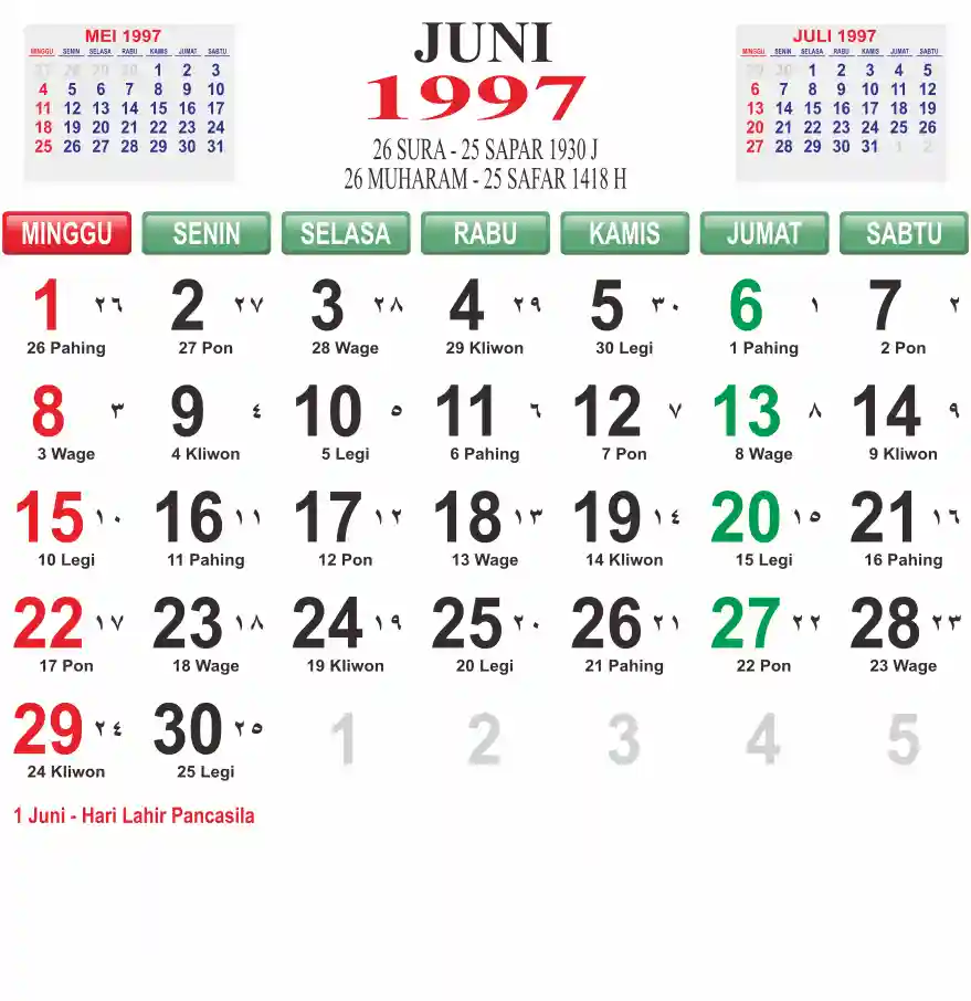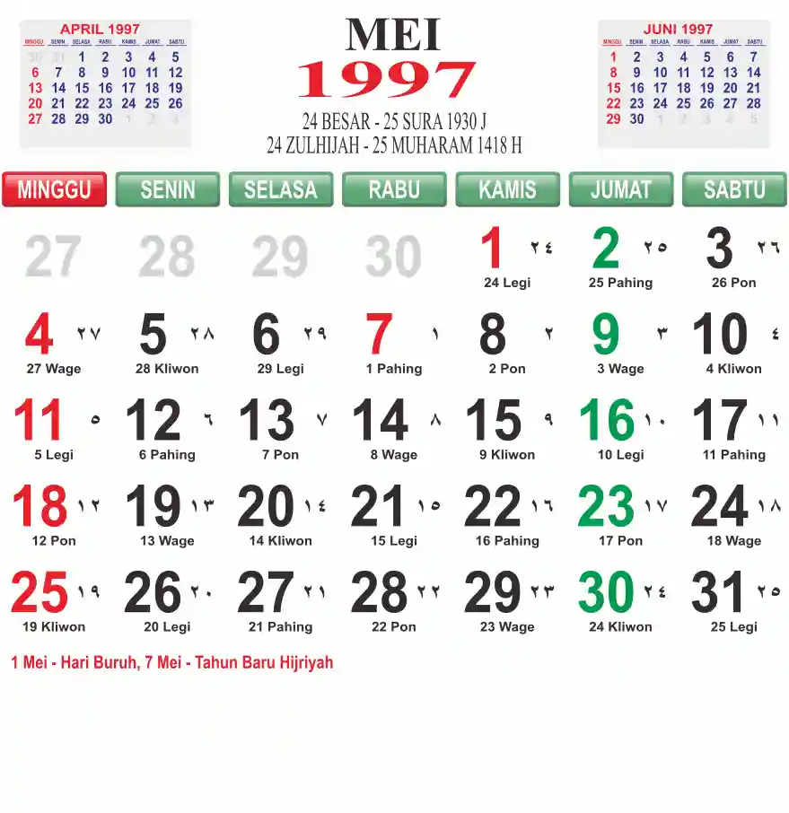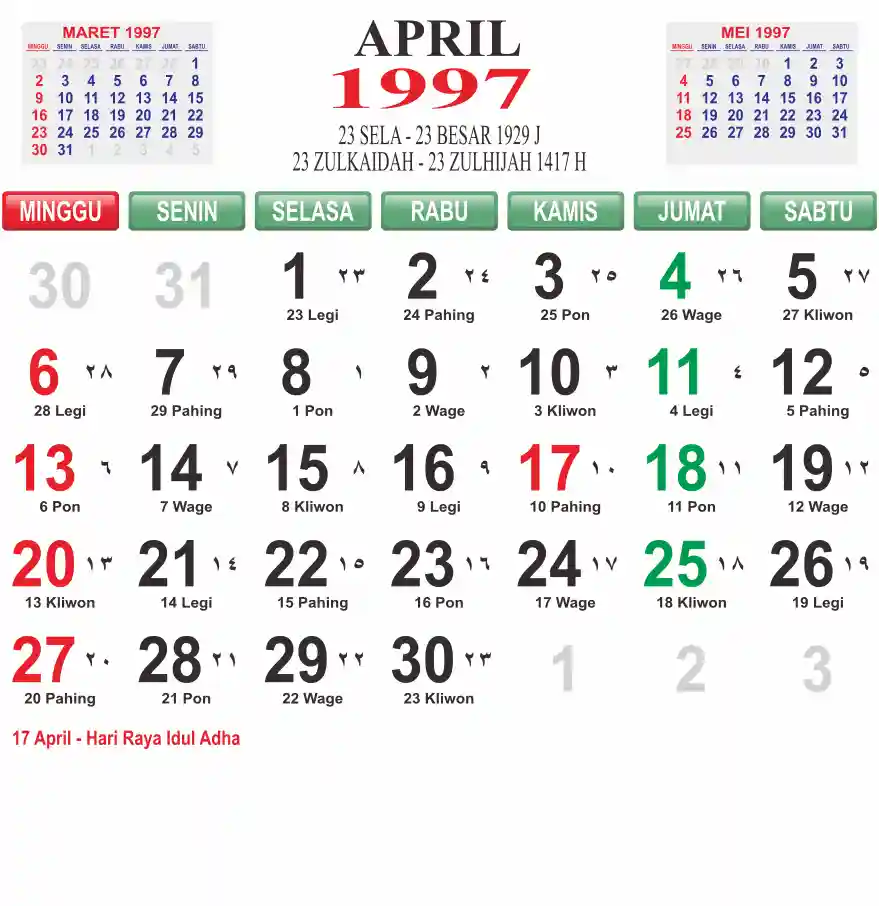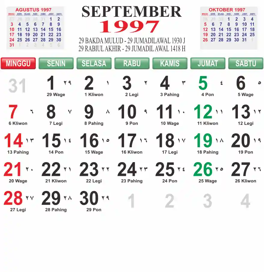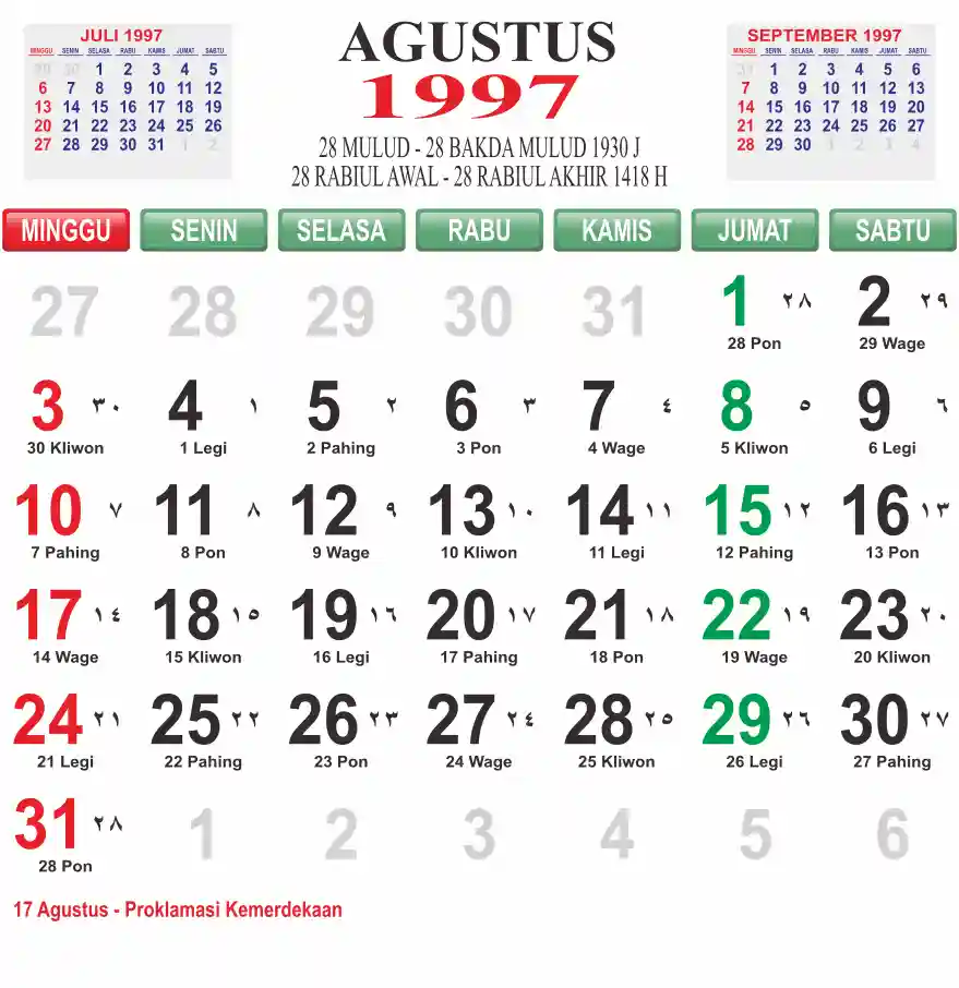 Template kalender 1997 lembaran besar jumbo yang mudah di baca dari jarak jauh. Kalender ini biasanya di cetak 1 lembar per bulan.