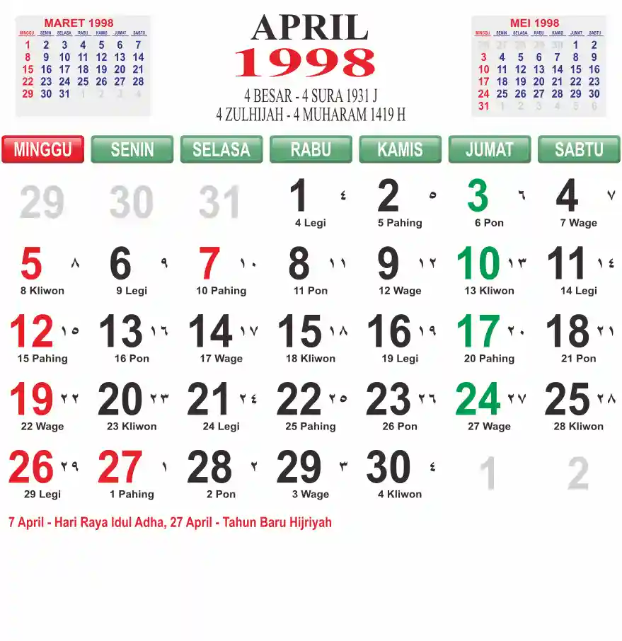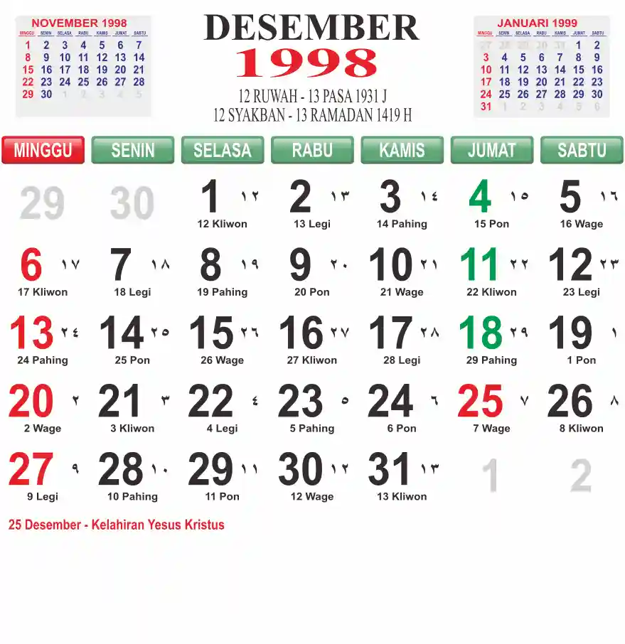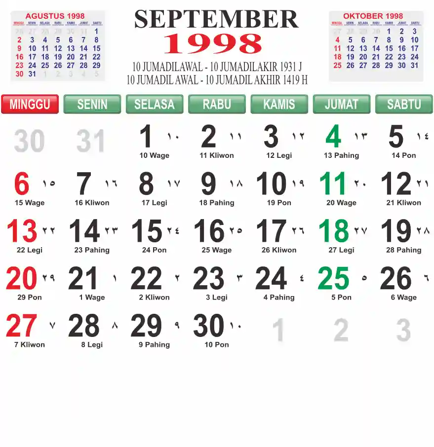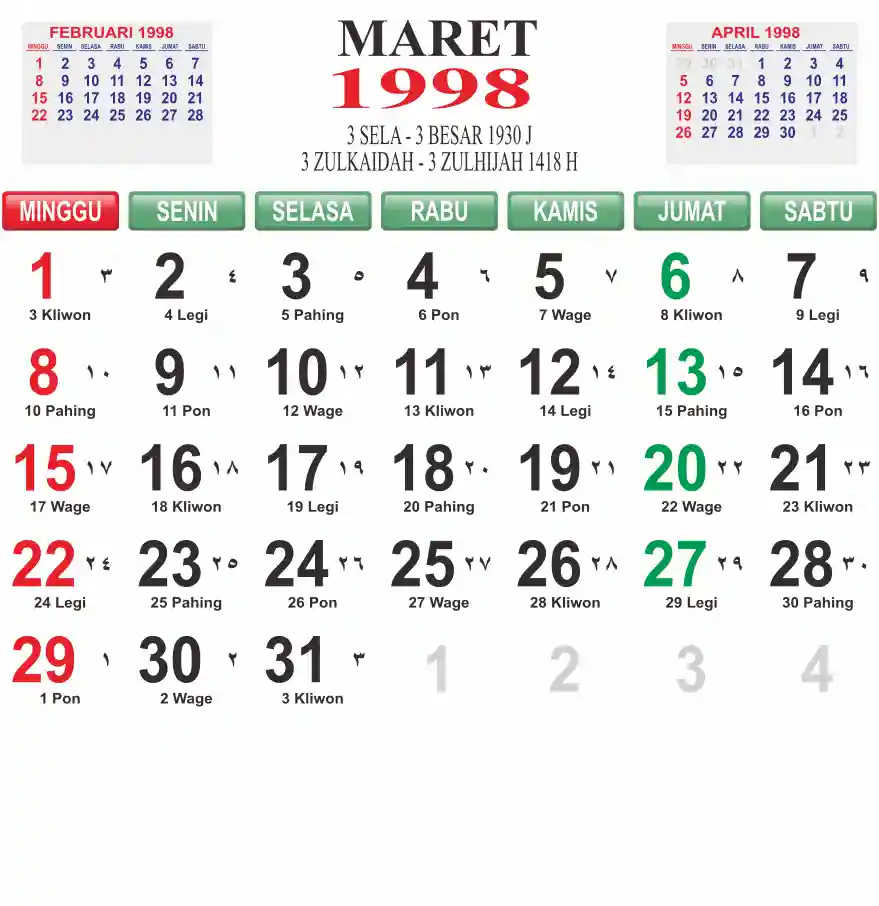 Template kalender 1998 lembaran besar jumbo yang mudah di baca dari jarak jauh. Kalender ini biasanya di cetak 1 lembar per bulan.