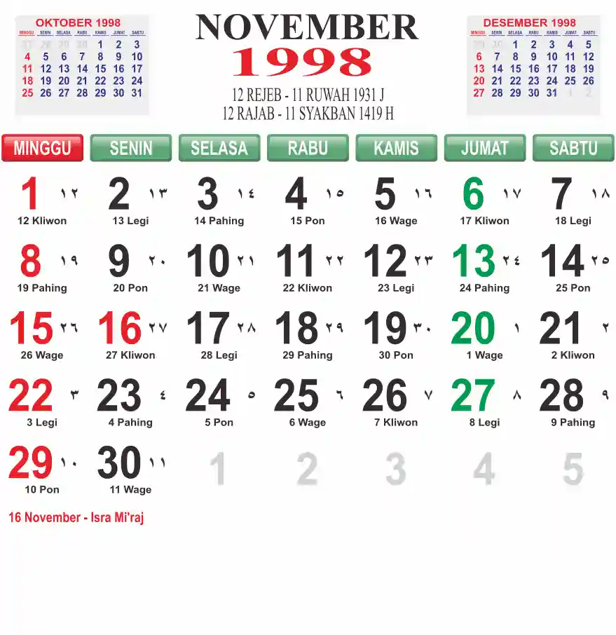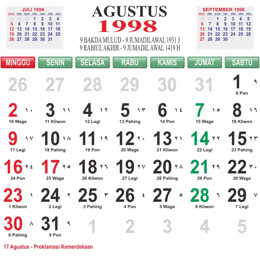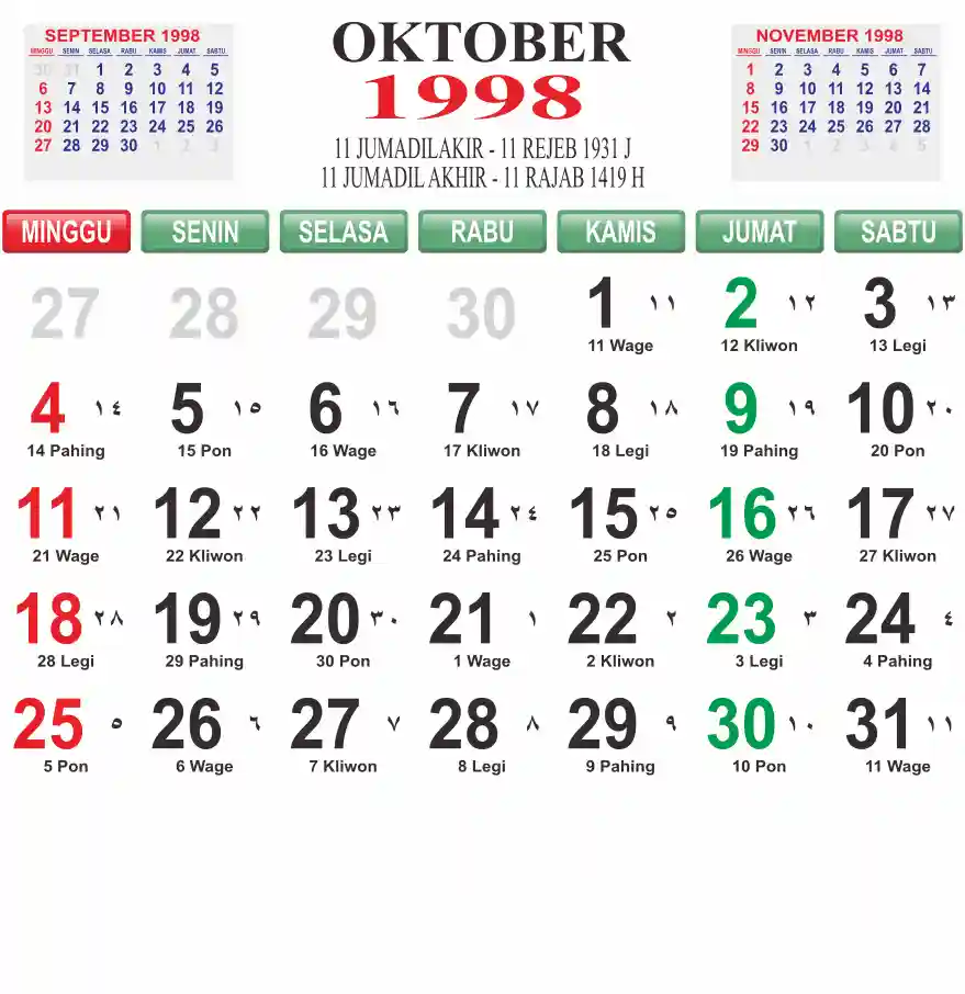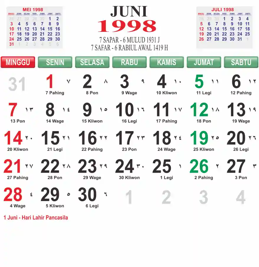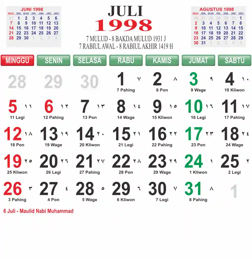 Template kalender 1998 lembaran besar jumbo yang mudah di baca dari jarak jauh. Kalender ini biasanya di cetak 1 lembar per bulan.