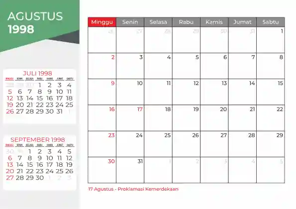 Template kalender 1998 duduk planner. Ada space kosong yang bisa di isi untuk menulis catatan. Fokus utama kalender ini adalah sebagia planner.