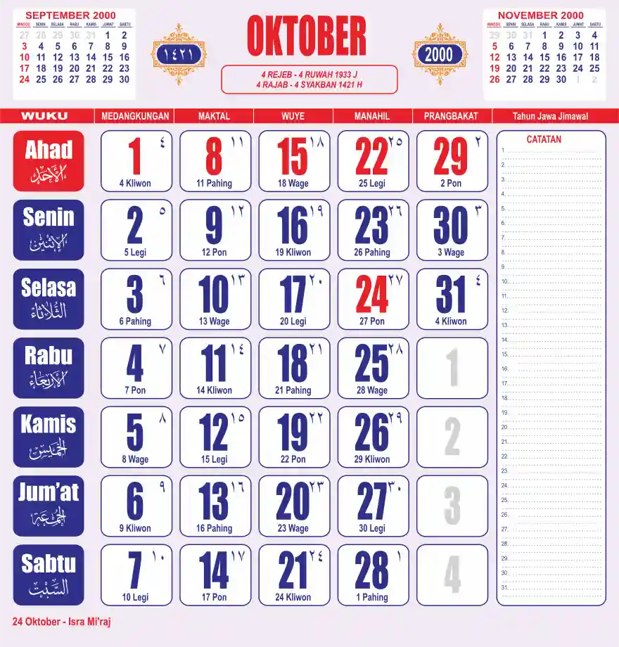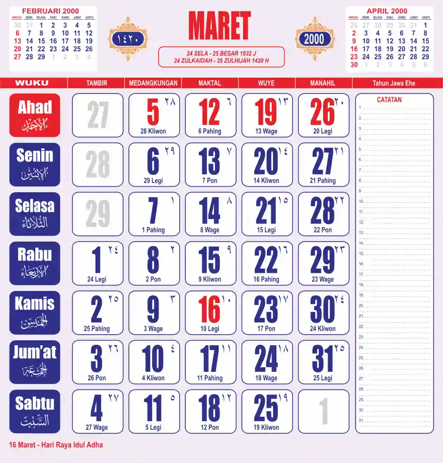 Template kalender 2000 lembaran besar jumbo yang sering dipakai oleh masyarakat jawa lengkap dengan wuku. Kalender ini biasanya di cetak 1 lembar per bulan.