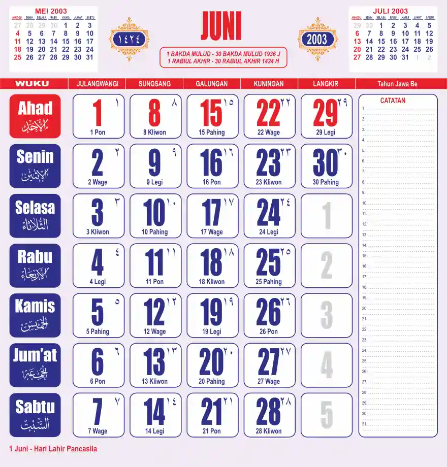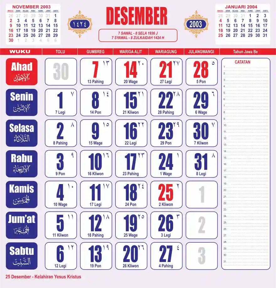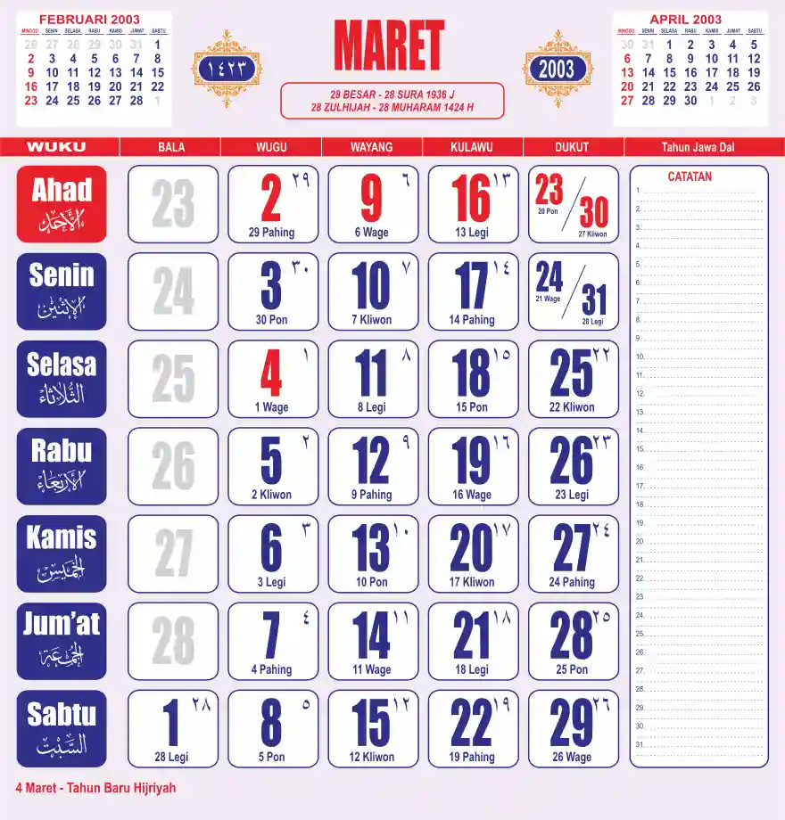 Template kalender 2003 lembaran besar jumbo yang sering dipakai oleh masyarakat jawa lengkap dengan wuku. Kalender ini biasanya di cetak 1 lembar per bulan.