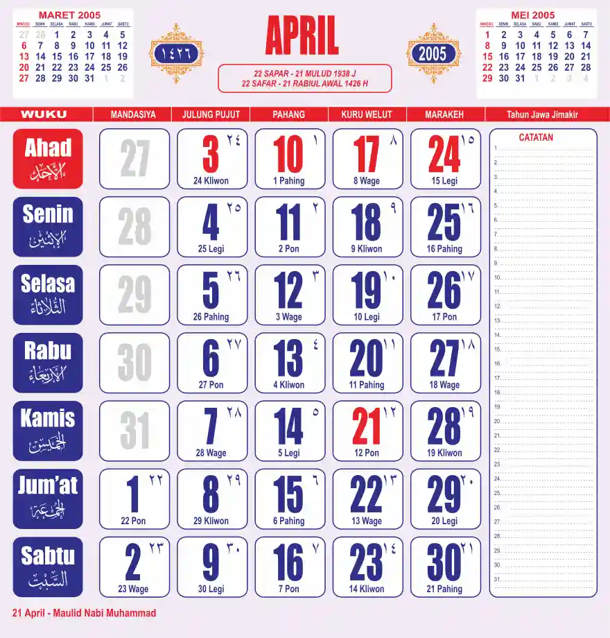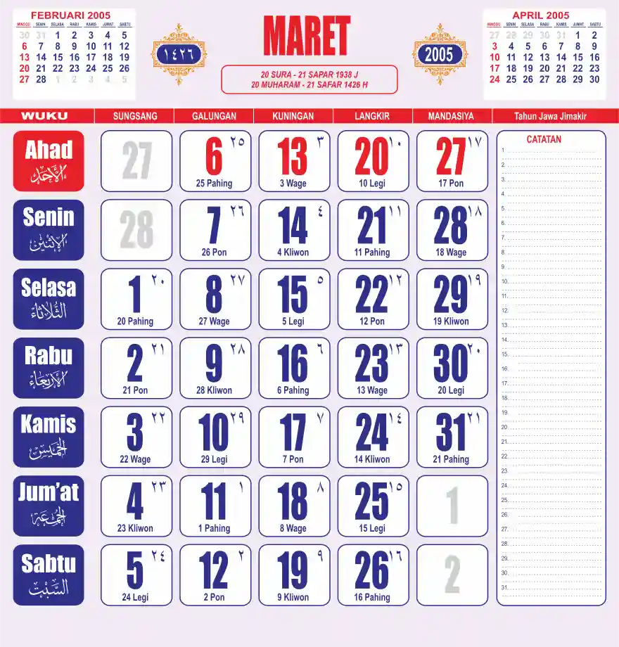 Template kalender 2005 lembaran besar jumbo yang sering dipakai oleh masyarakat jawa lengkap dengan wuku. Kalender ini biasanya di cetak 1 lembar per bulan.