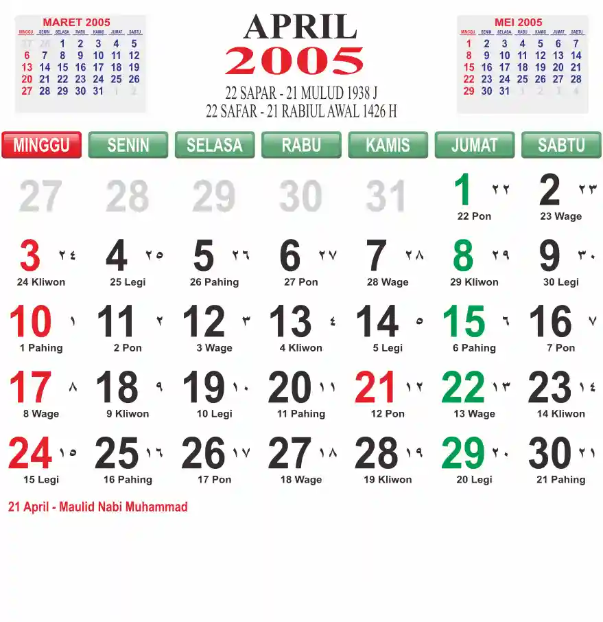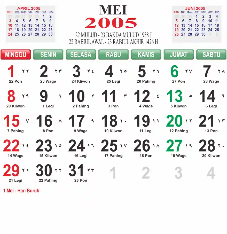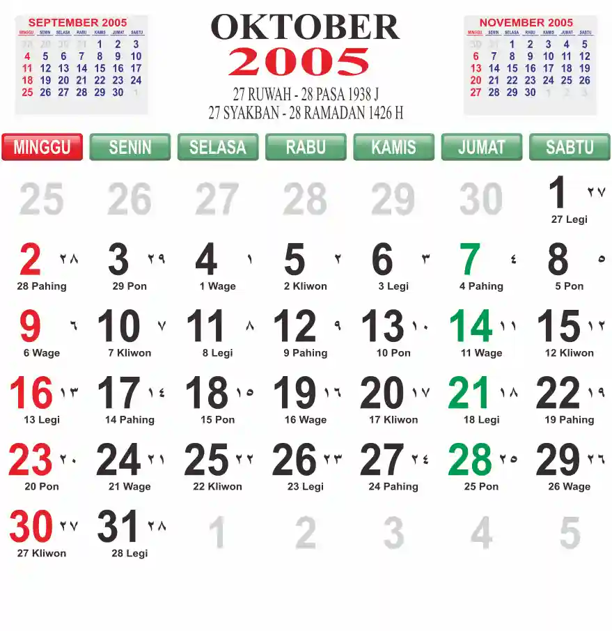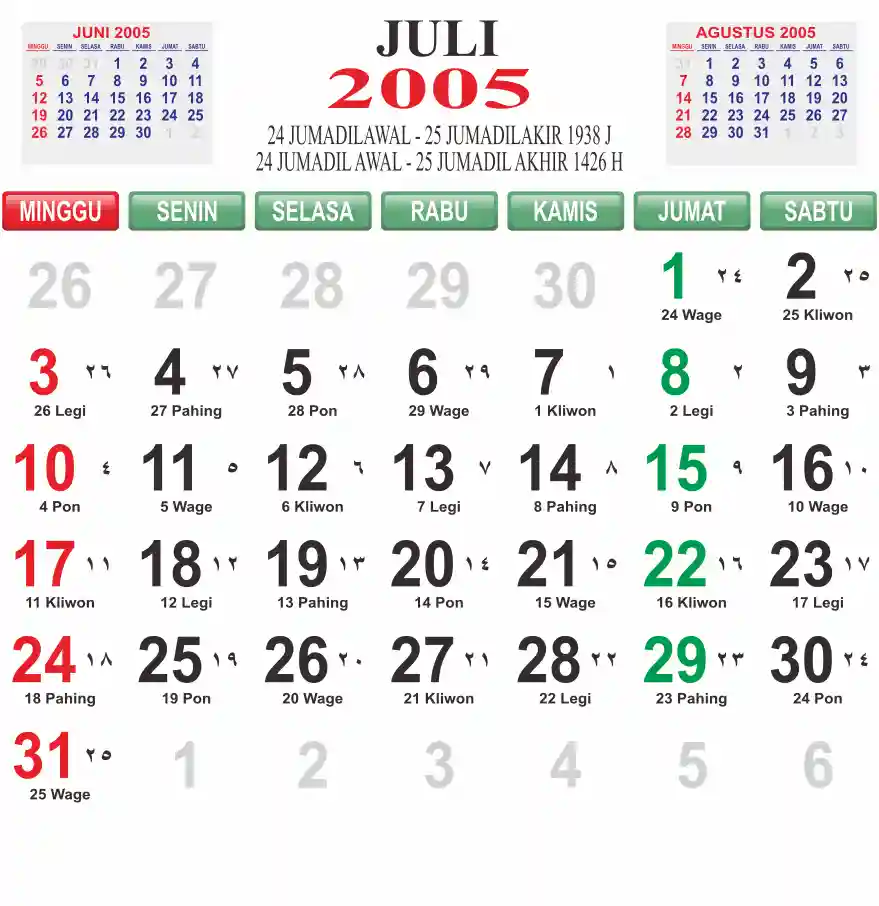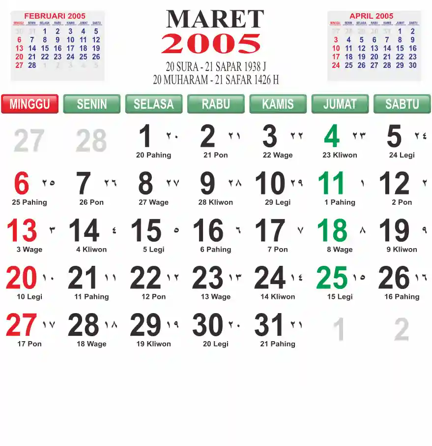 Template kalender 2005 lembaran besar jumbo yang mudah di baca dari jarak jauh. Kalender ini biasanya di cetak 1 lembar per bulan.