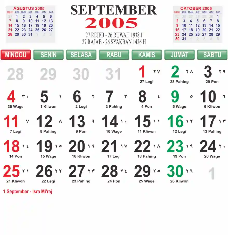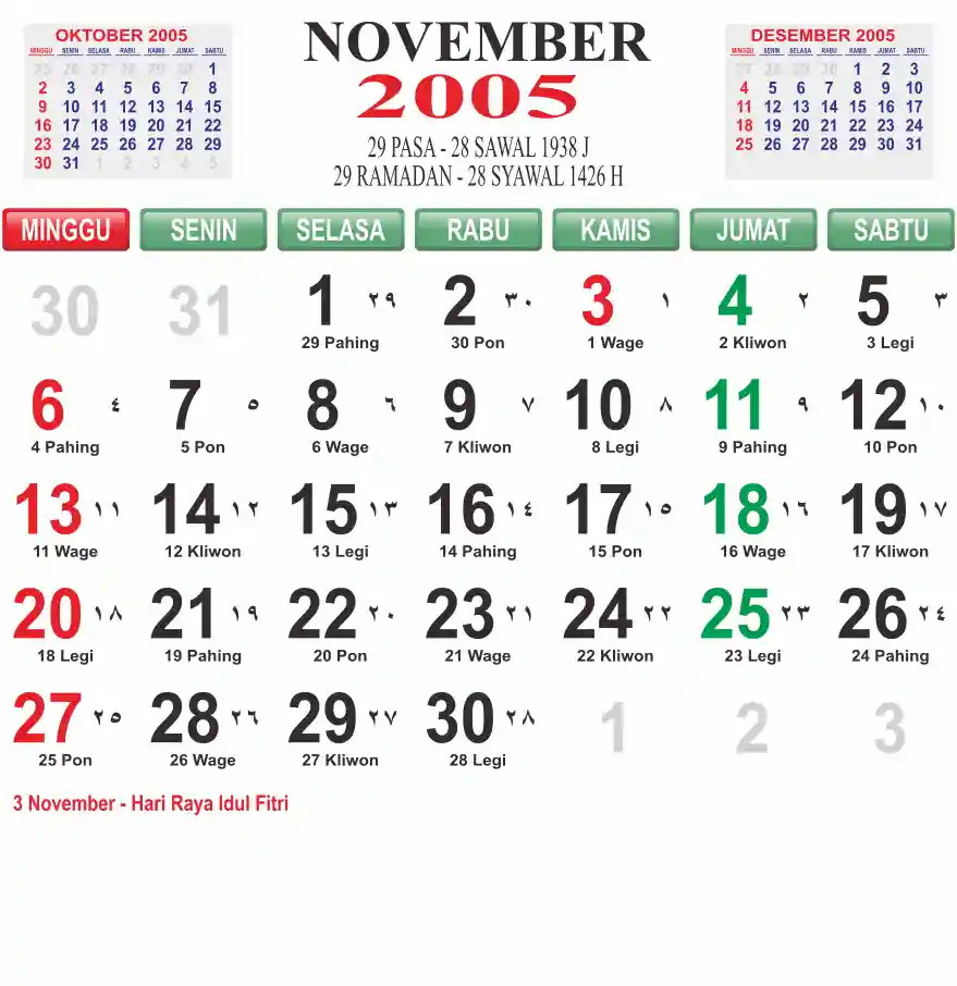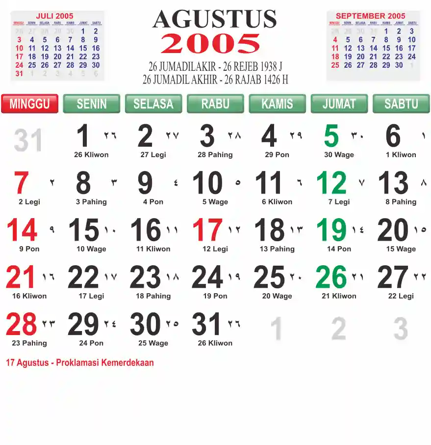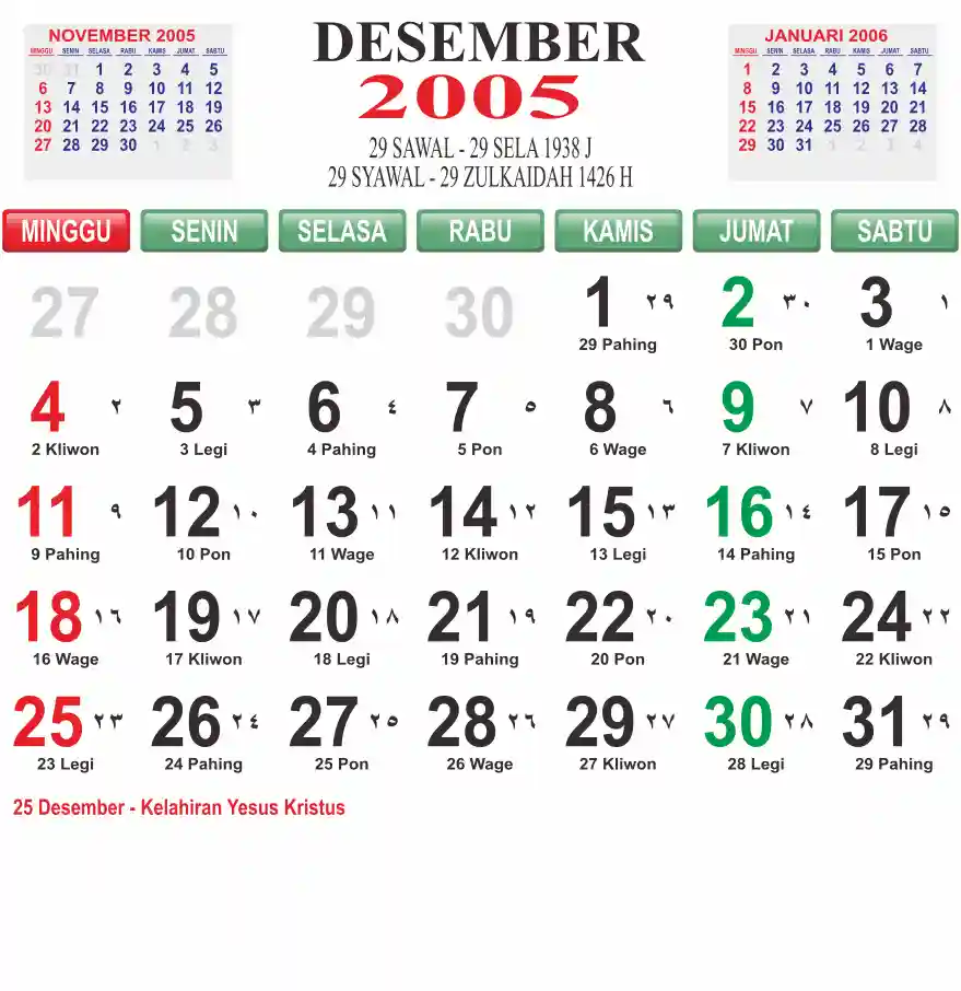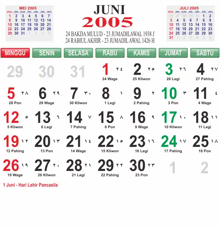 Template kalender 2005 lembaran besar jumbo yang mudah di baca dari jarak jauh. Kalender ini biasanya di cetak 1 lembar per bulan.