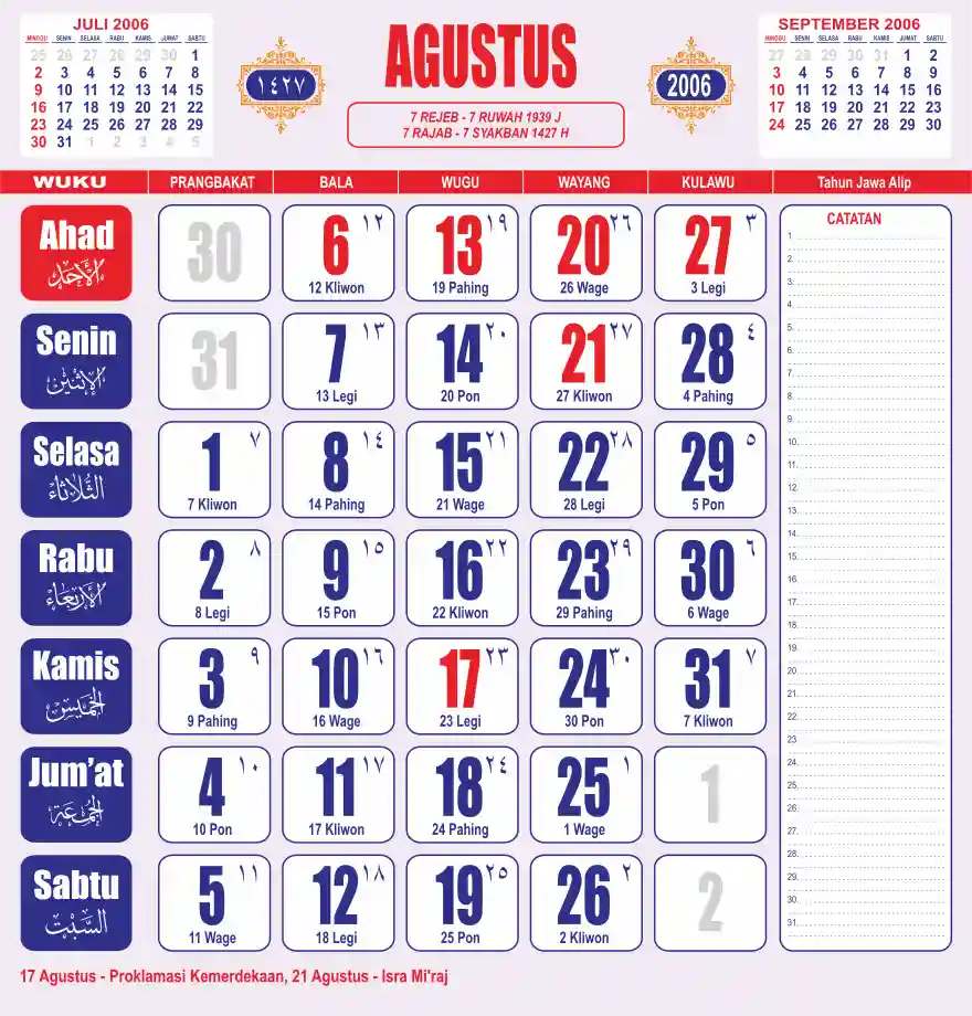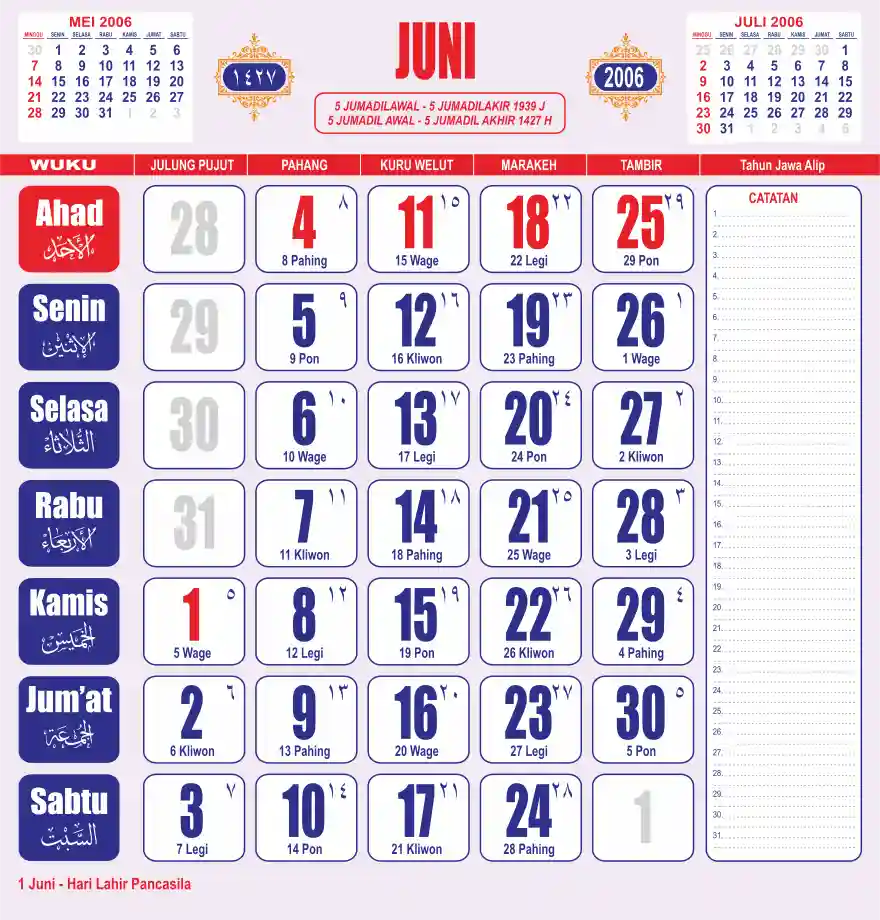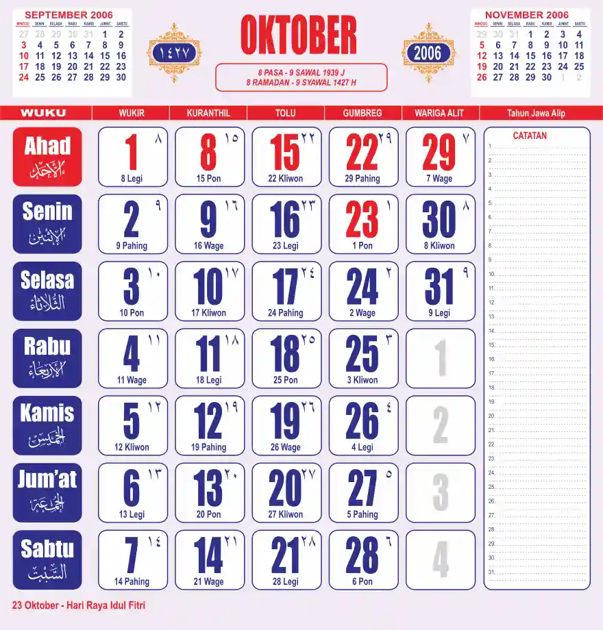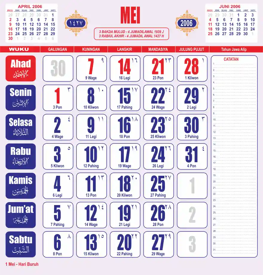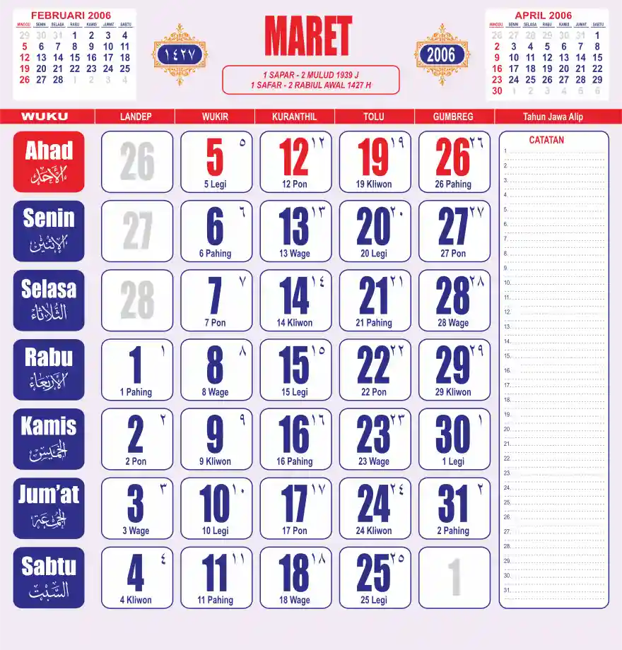 Template kalender 2006 lembaran besar jumbo yang sering dipakai oleh masyarakat jawa lengkap dengan wuku. Kalender ini biasanya di cetak 1 lembar per bulan.