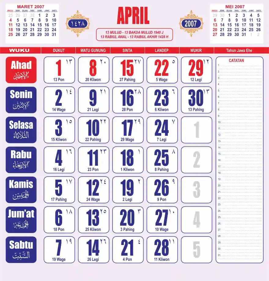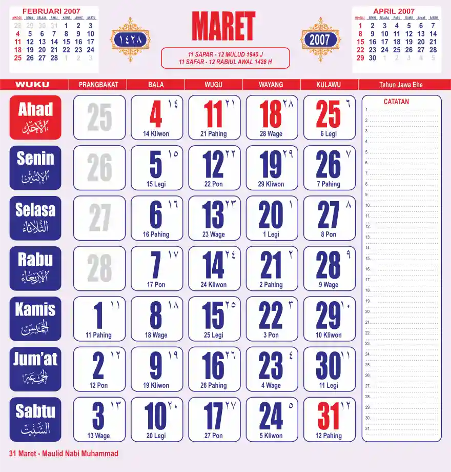 Template kalender 2007 lembaran besar jumbo yang sering dipakai oleh masyarakat jawa lengkap dengan wuku. Kalender ini biasanya di cetak 1 lembar per bulan.