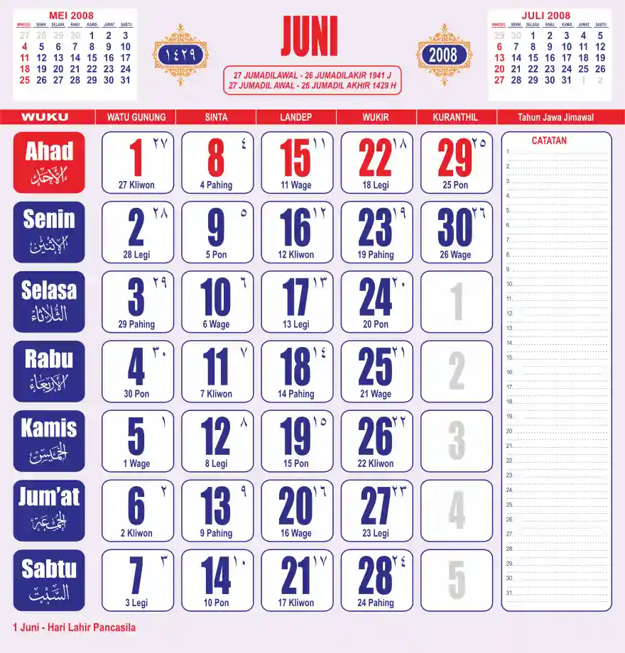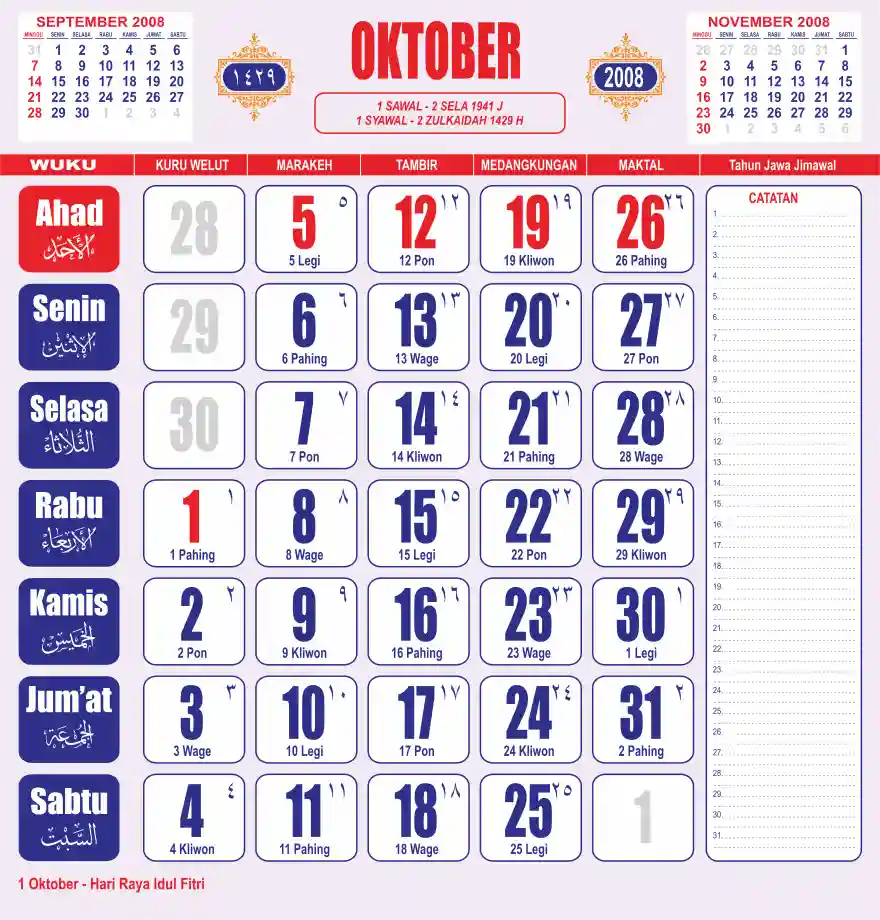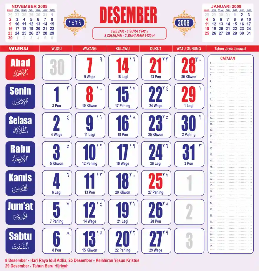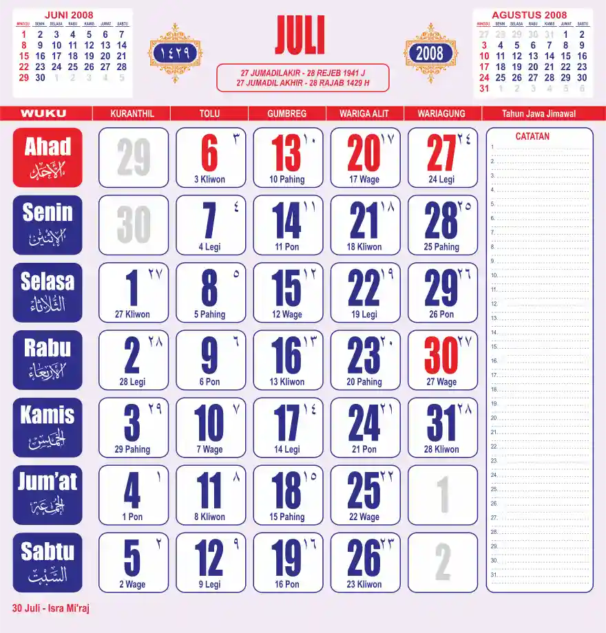Template kalender 2008 lembaran besar jumbo yang sering dipakai oleh masyarakat jawa lengkap dengan wuku. Kalender ini biasanya di cetak 1 lembar per bulan.