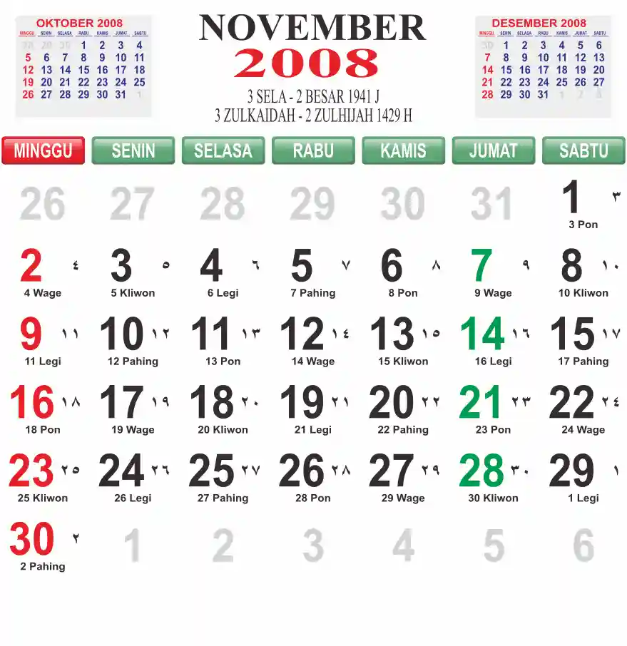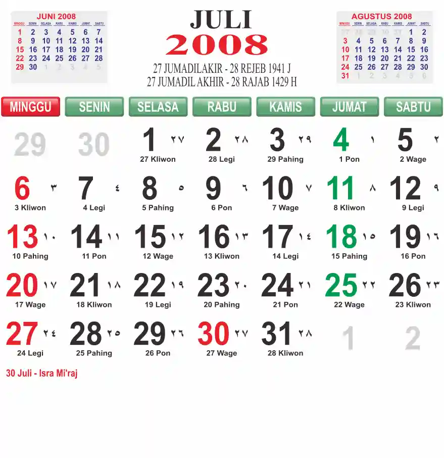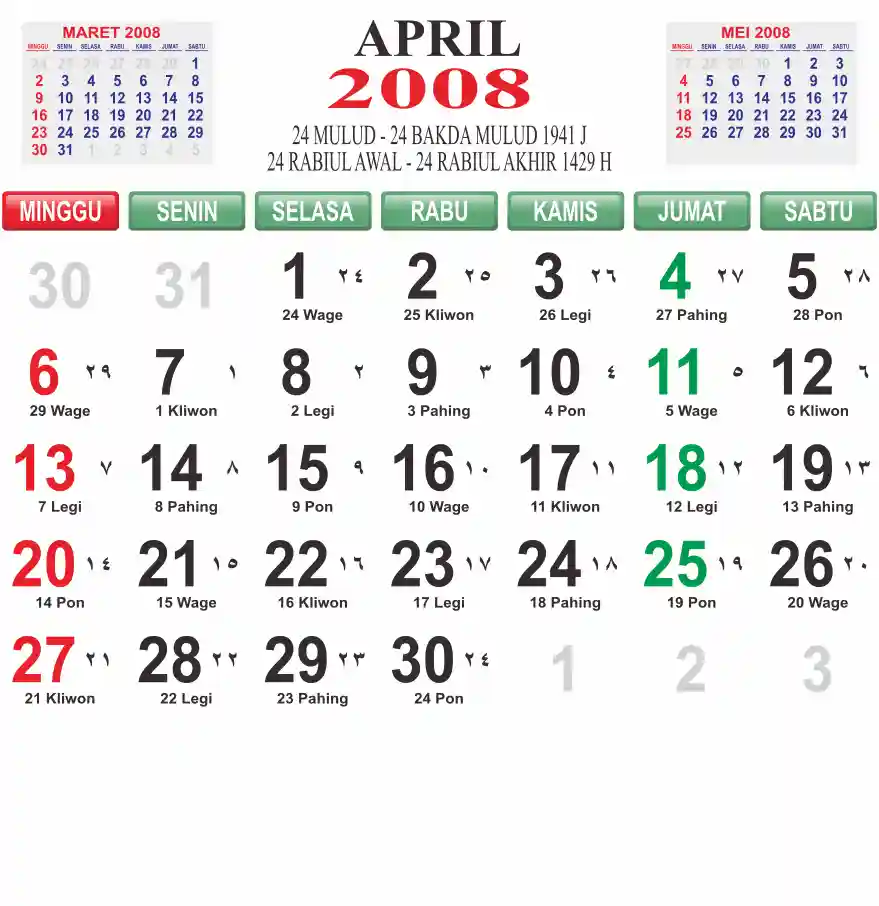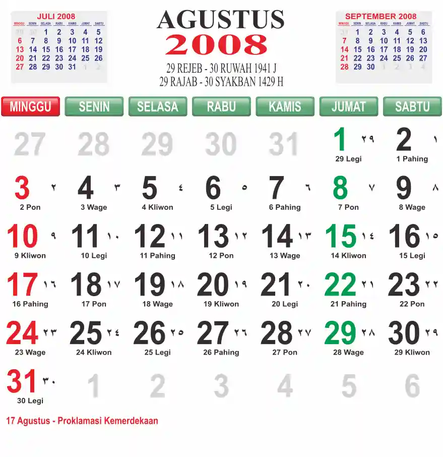 Template kalender 2008 lembaran besar jumbo yang mudah di baca dari jarak jauh. Kalender ini biasanya di cetak 1 lembar per bulan.